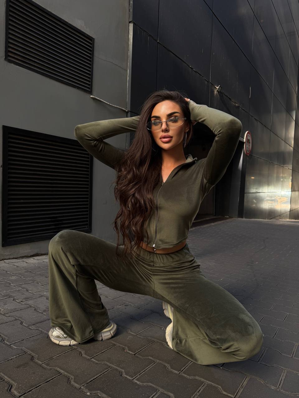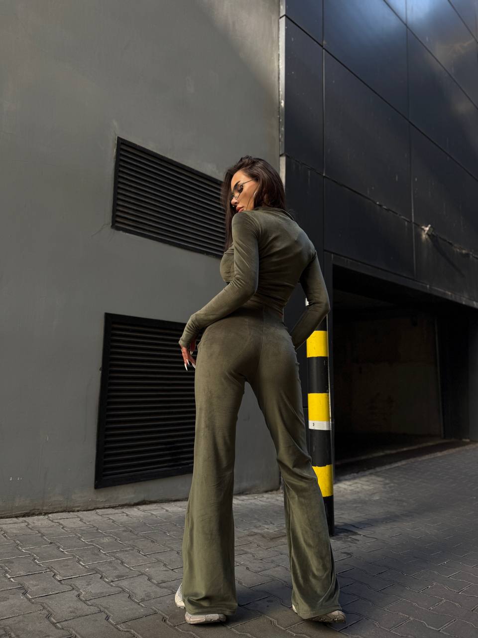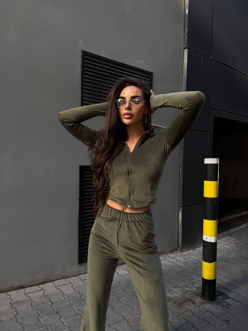 Жіночий Велюровий Костюм Хакі Двійка – Укорочена Кофта на Блискавці + Штани Кльош