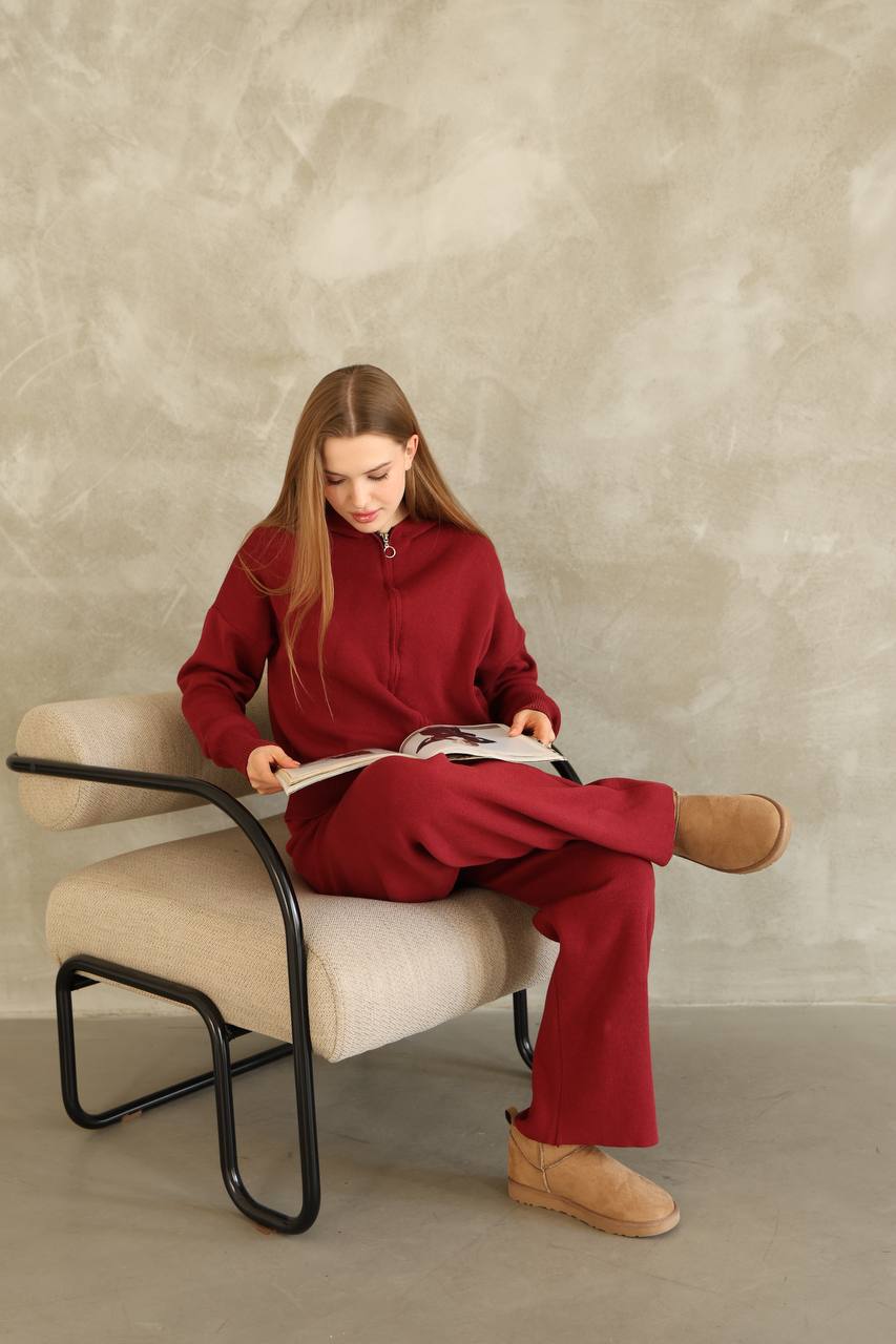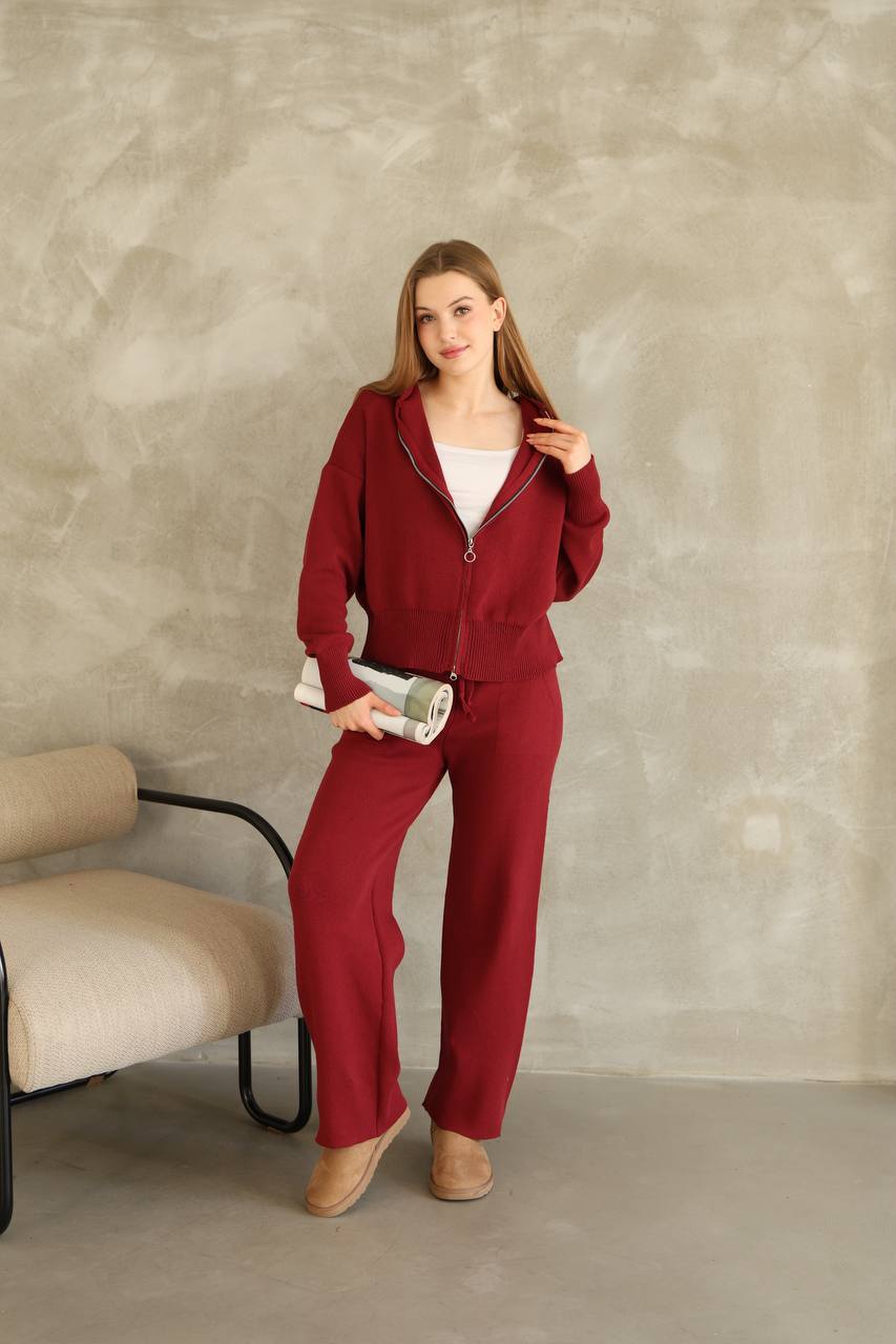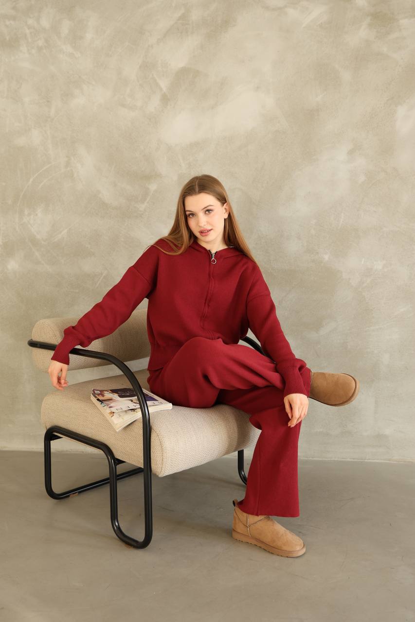 Жіночий Вільний Трикотажний Червоний Костюм Двійка – Джемпер на Блискавці + Штани Палаццо