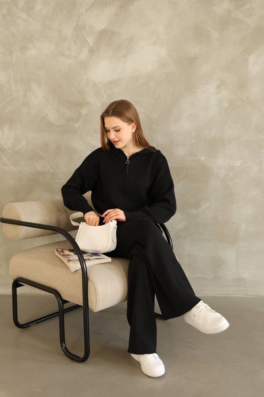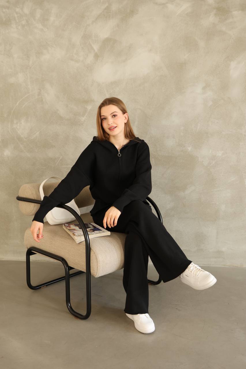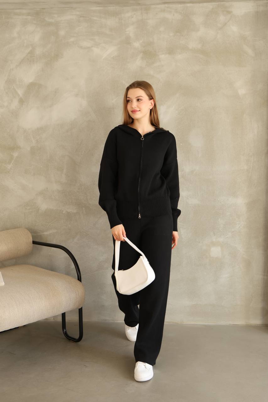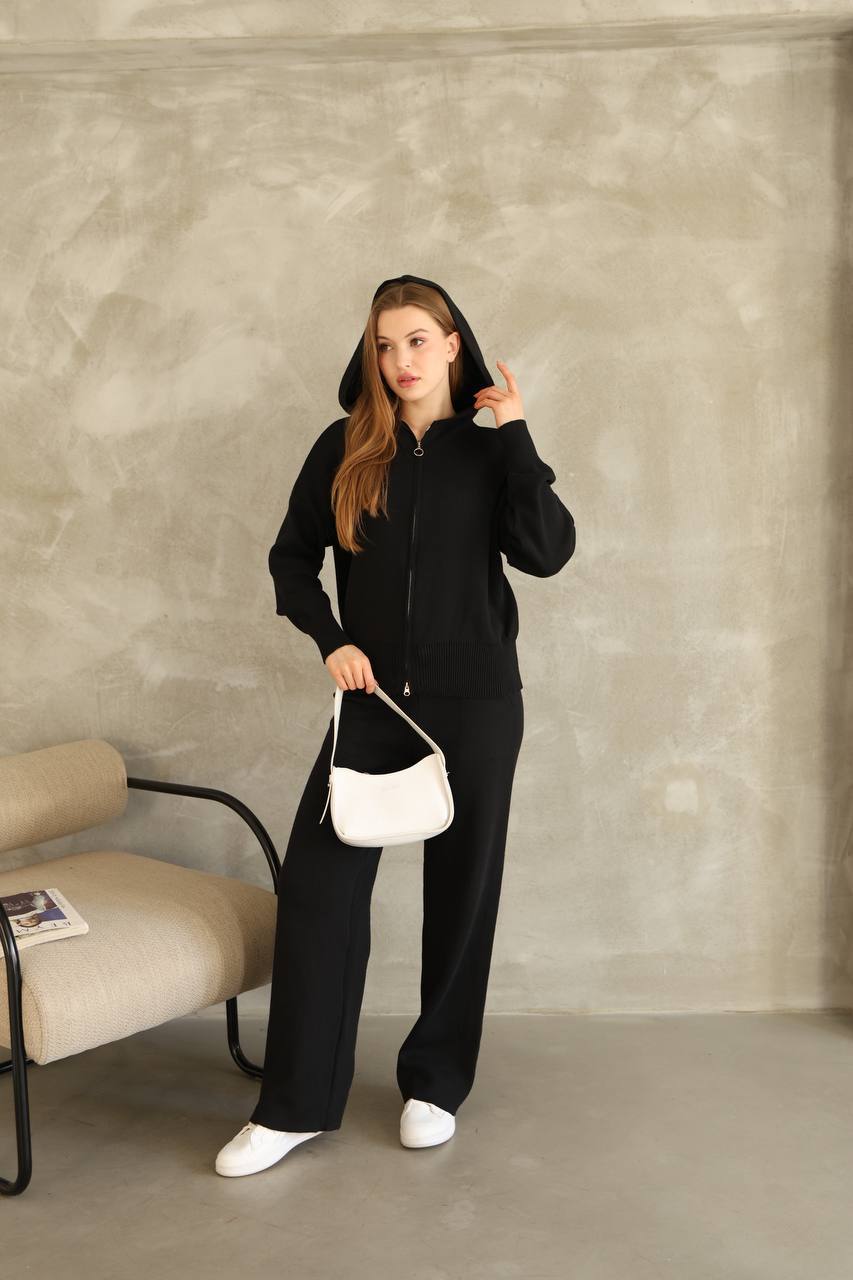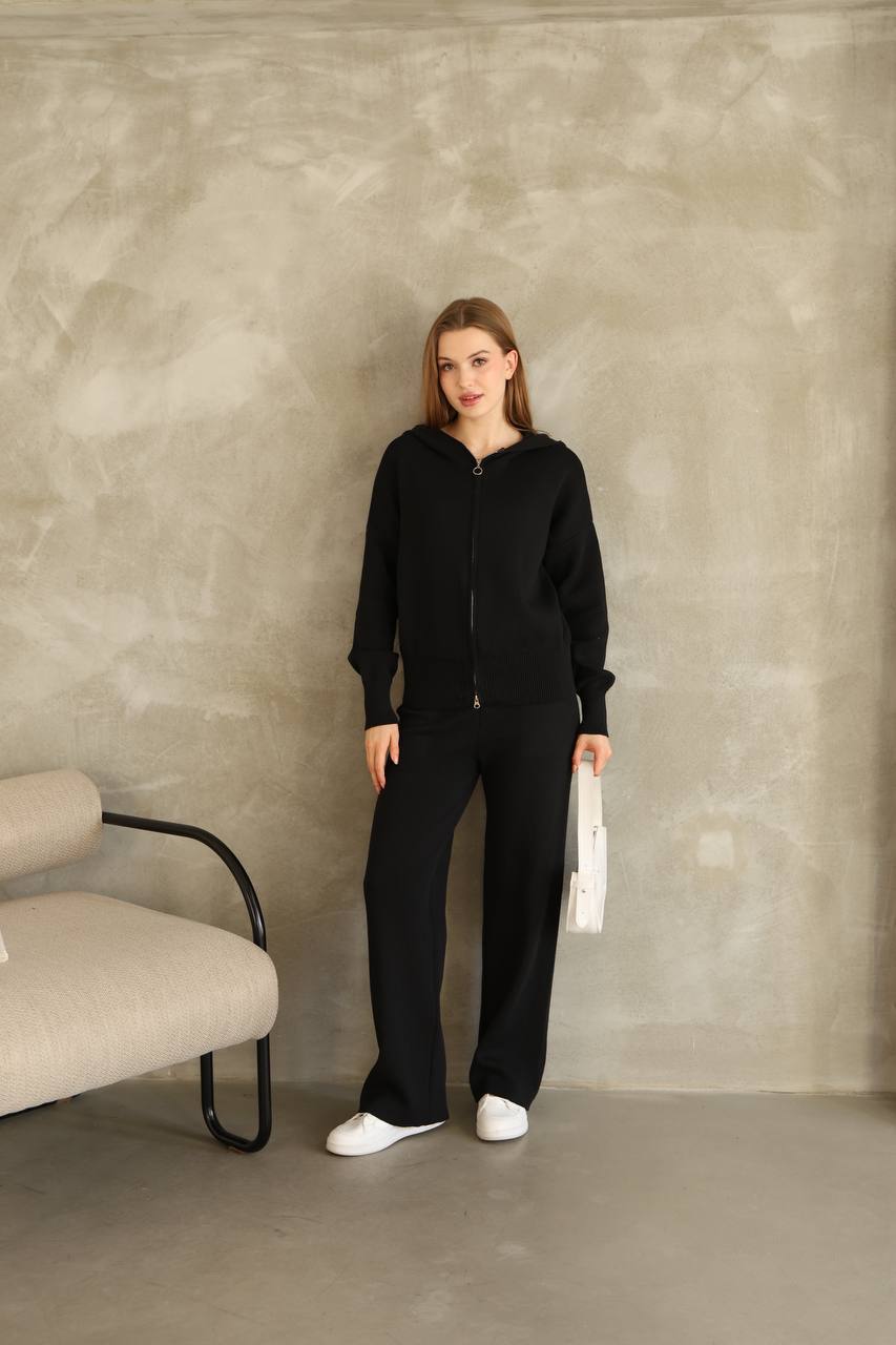 Жіночий Вільний Трикотажний Чорний Костюм Двійка – Джемпер на Блискавці + Штани Палаццо