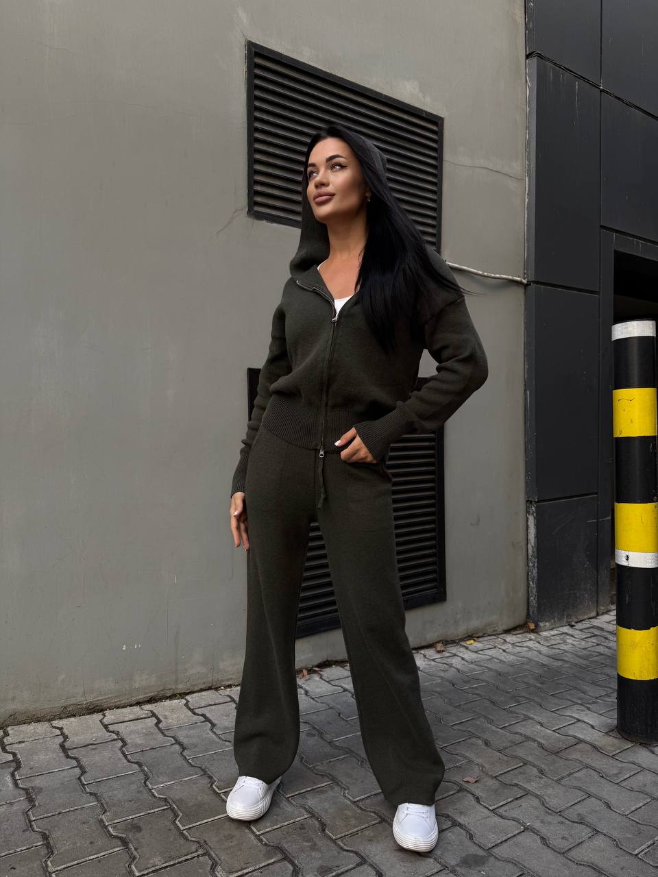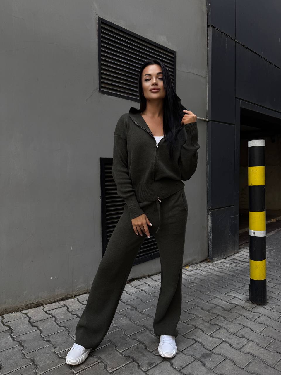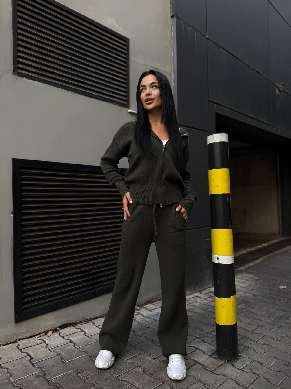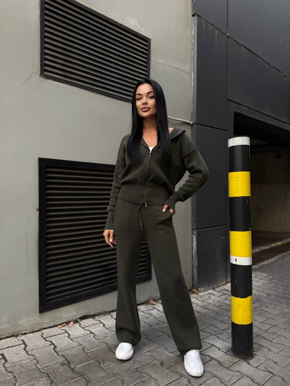 Жіночий Вільний Трикотажний Костюм Хакі Двійка – Джемпер на Блискавці + Штани Палаццо