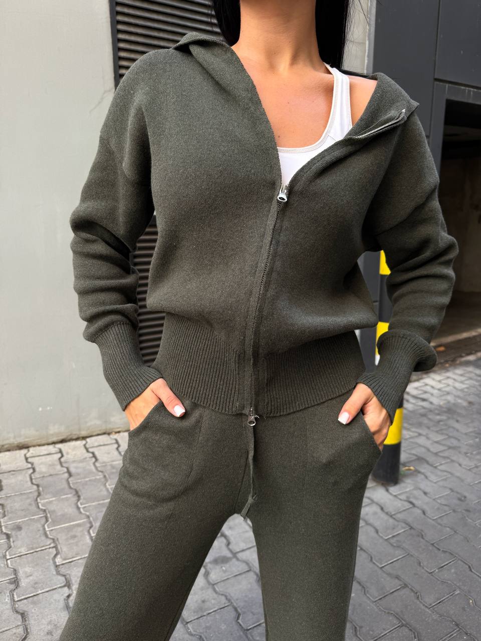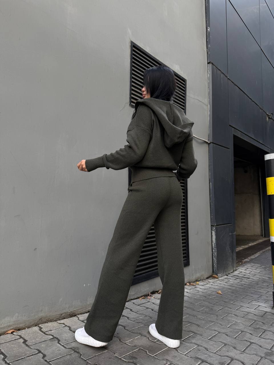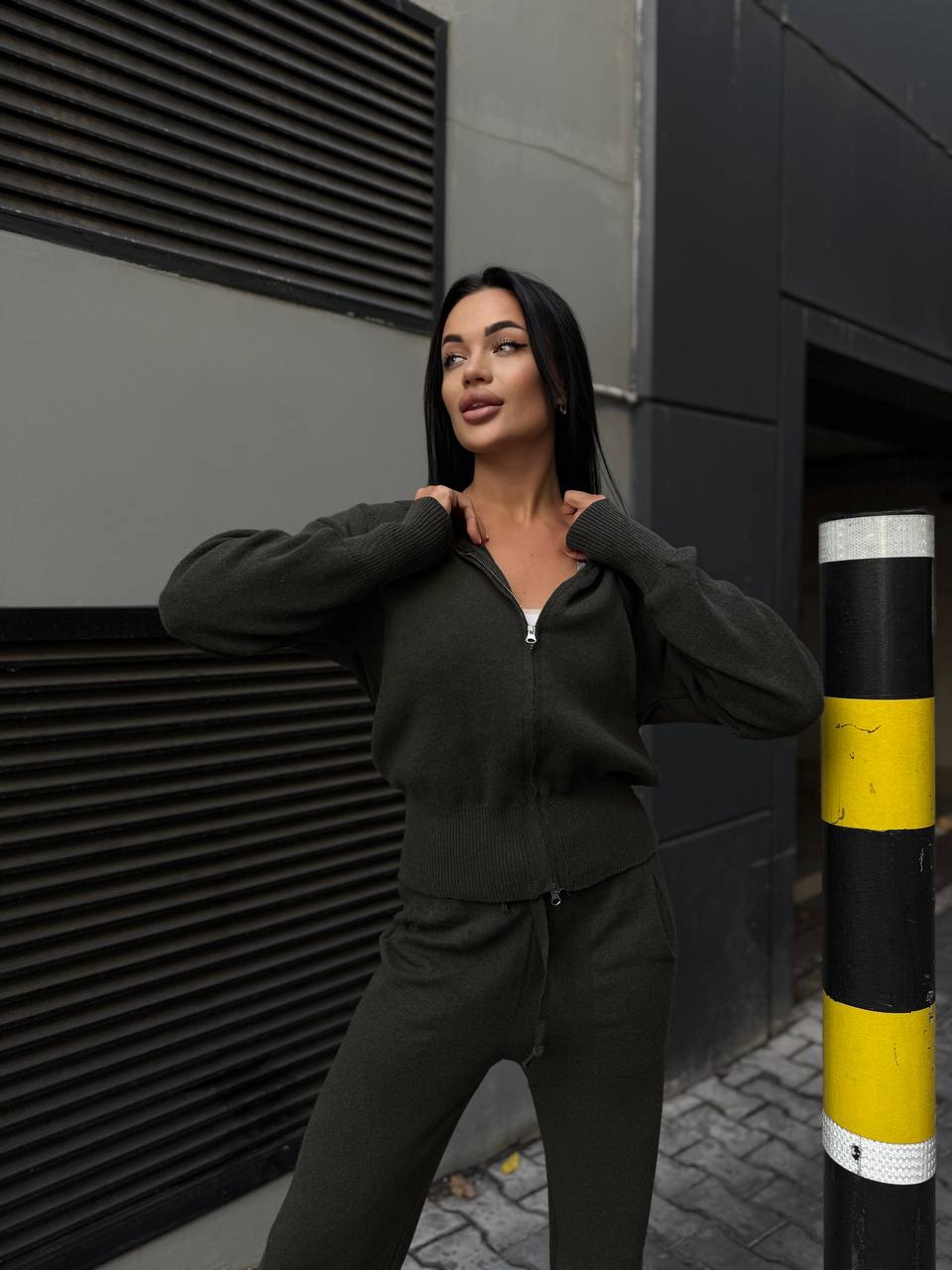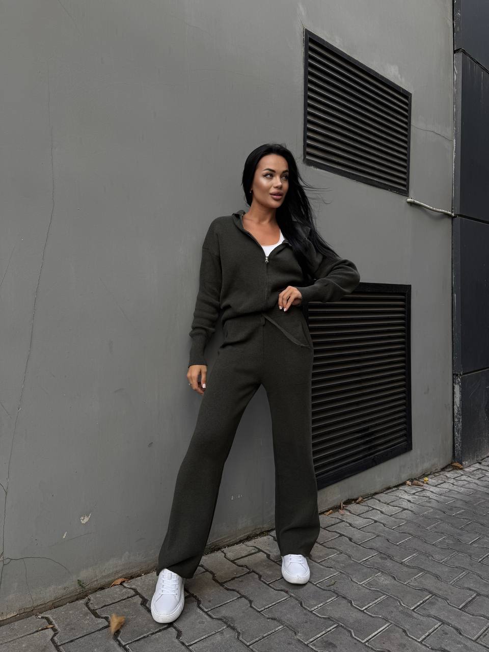 Жіночий Вільний Трикотажний Костюм Хакі Двійка – Джемпер на Блискавці + Штани Палаццо