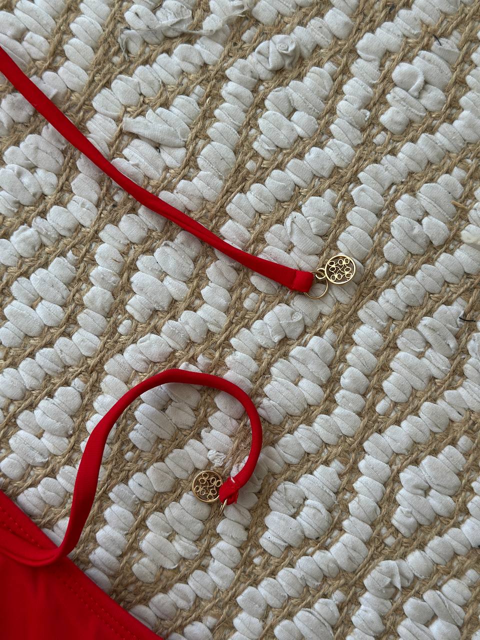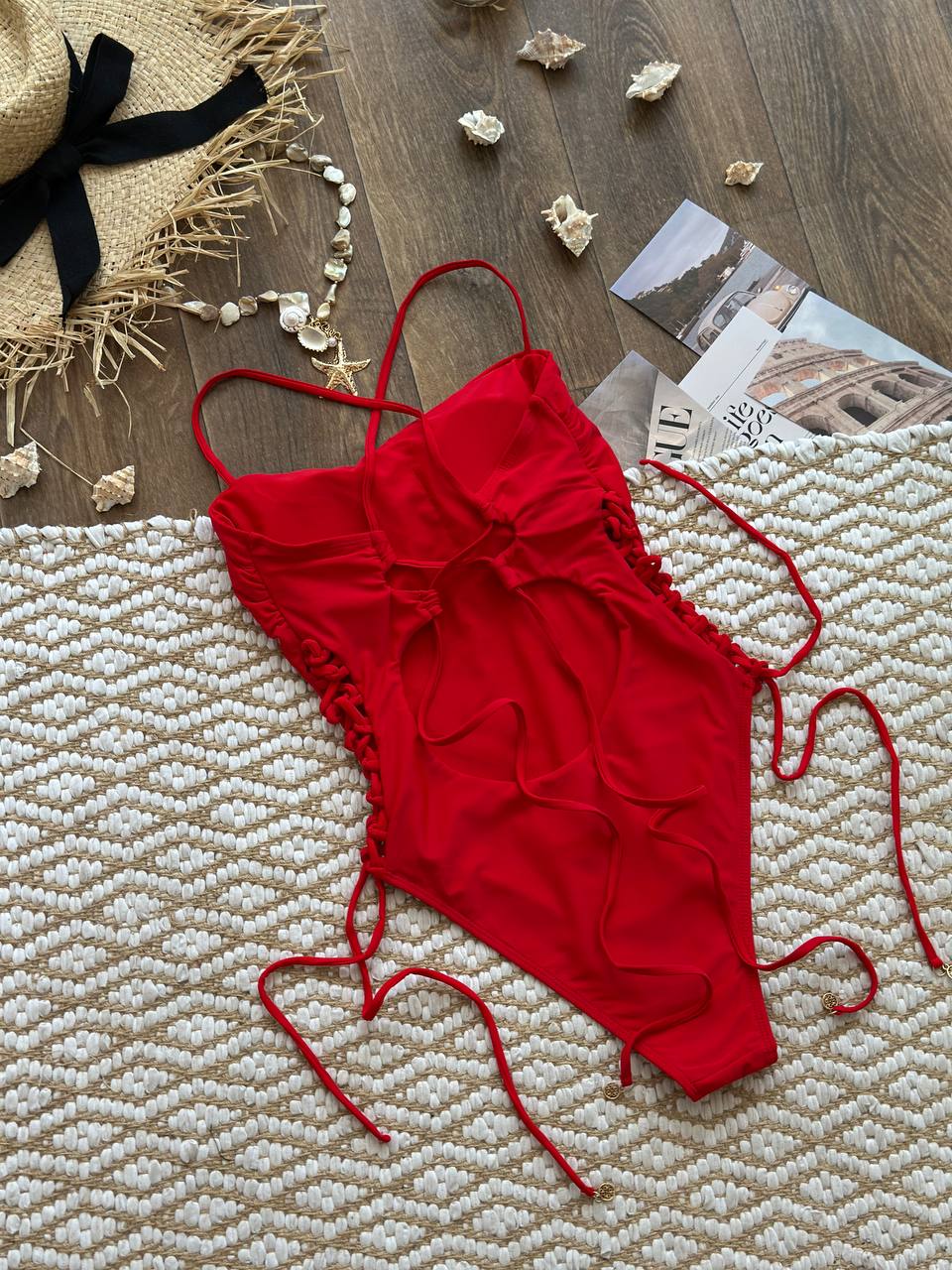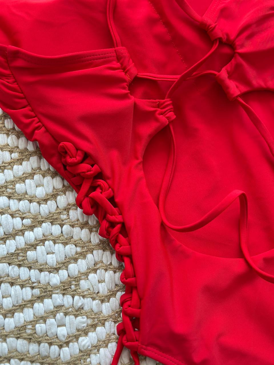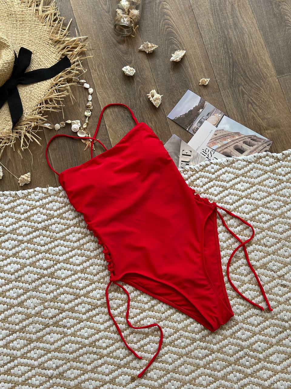 Жіночий Суцільний Червоний Купальник на Тонких Бретелях зі Шнурівками по Боках