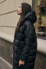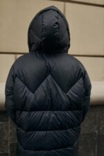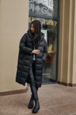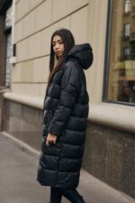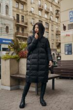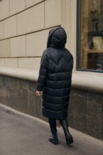 Жіноча Довга Зимова Чорна Куртка Нижче Колін – Стьобана на Блискавці з Капюшоном