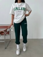 Жіночий Літній Костюм з Принтом Написом ‘Valiri’ – Біла Футболка + Зелені Джоґери