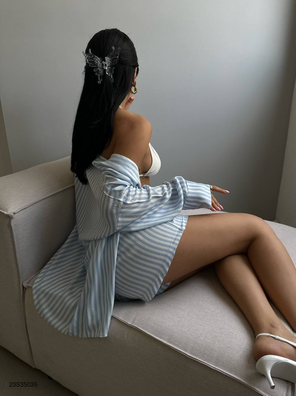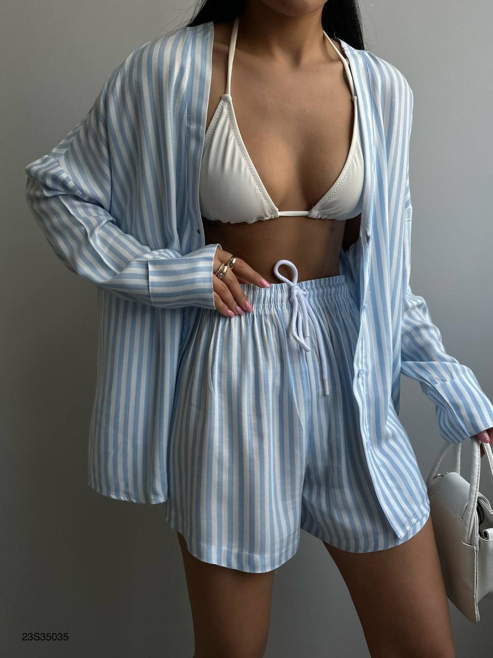 Жіночий Полосатий Блакитний Літній Комплект Вільного Крою (Сорочка + Шорти)