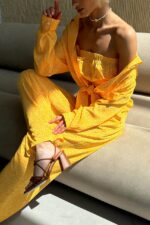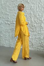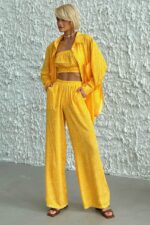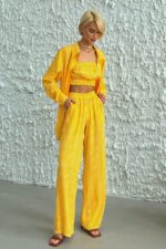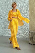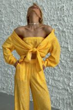 Жіночий Жовтий Костюм Трійка Шторм у Білих Точках – Топ + Сорочка + Штани