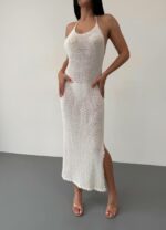 Жіноча Напівпрозора В’язана Пляжна Біла Туніка із Сіточки з Відкритою Спиною та Розрізом на Нозі