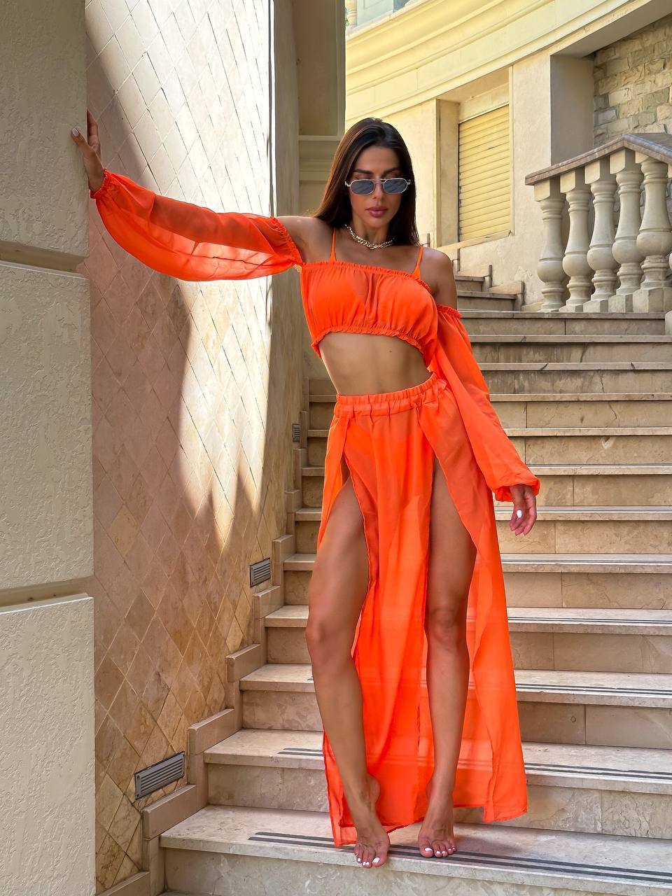 Жіночий Костюм-Двійка Помаранчевий – Легкий Шифоновий Літній Топ з Об’ємними Рукавами і Спідниця Довга з Розрізами