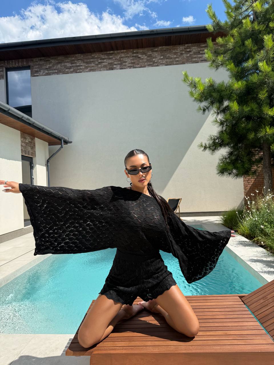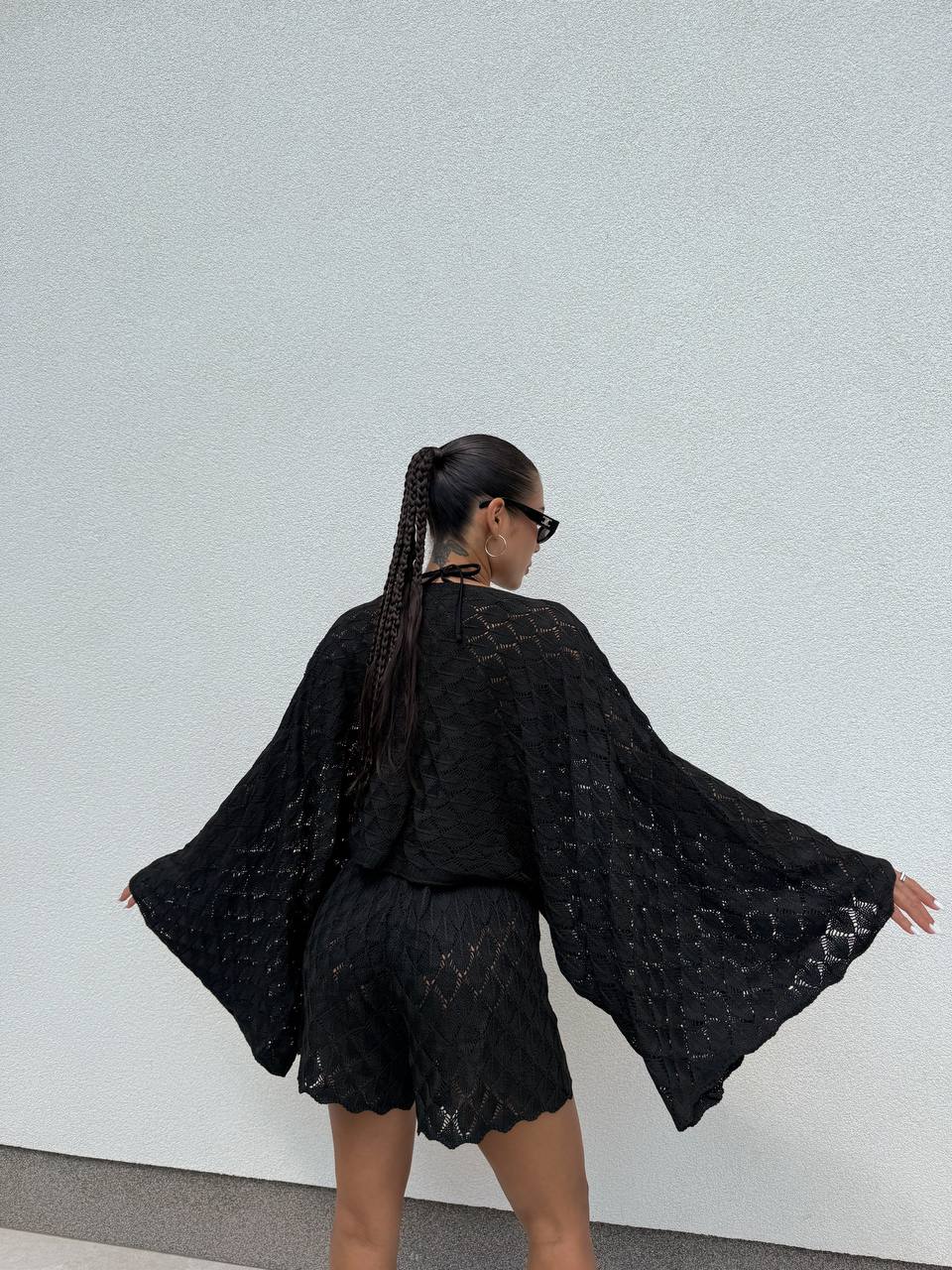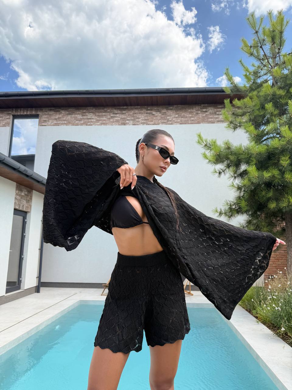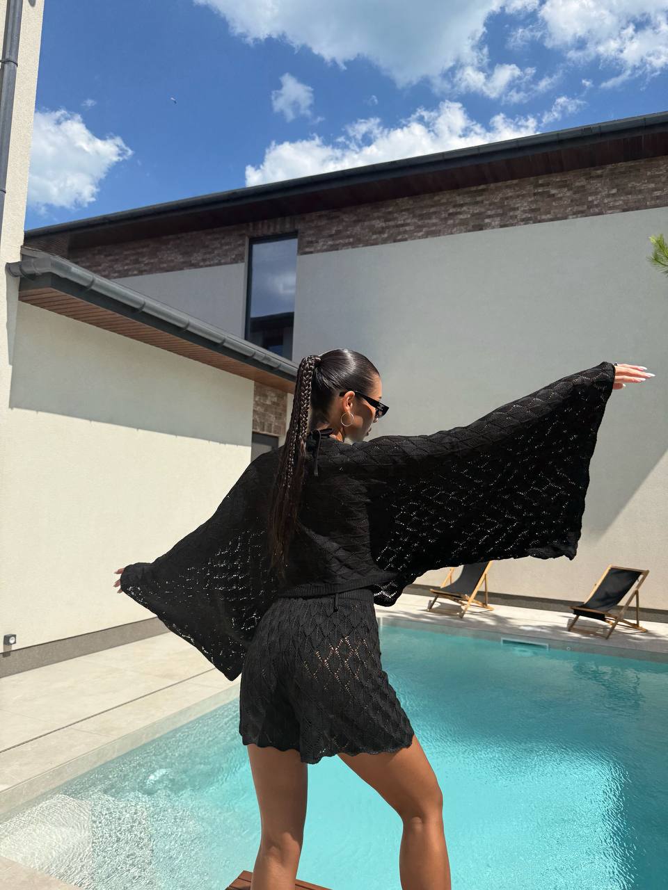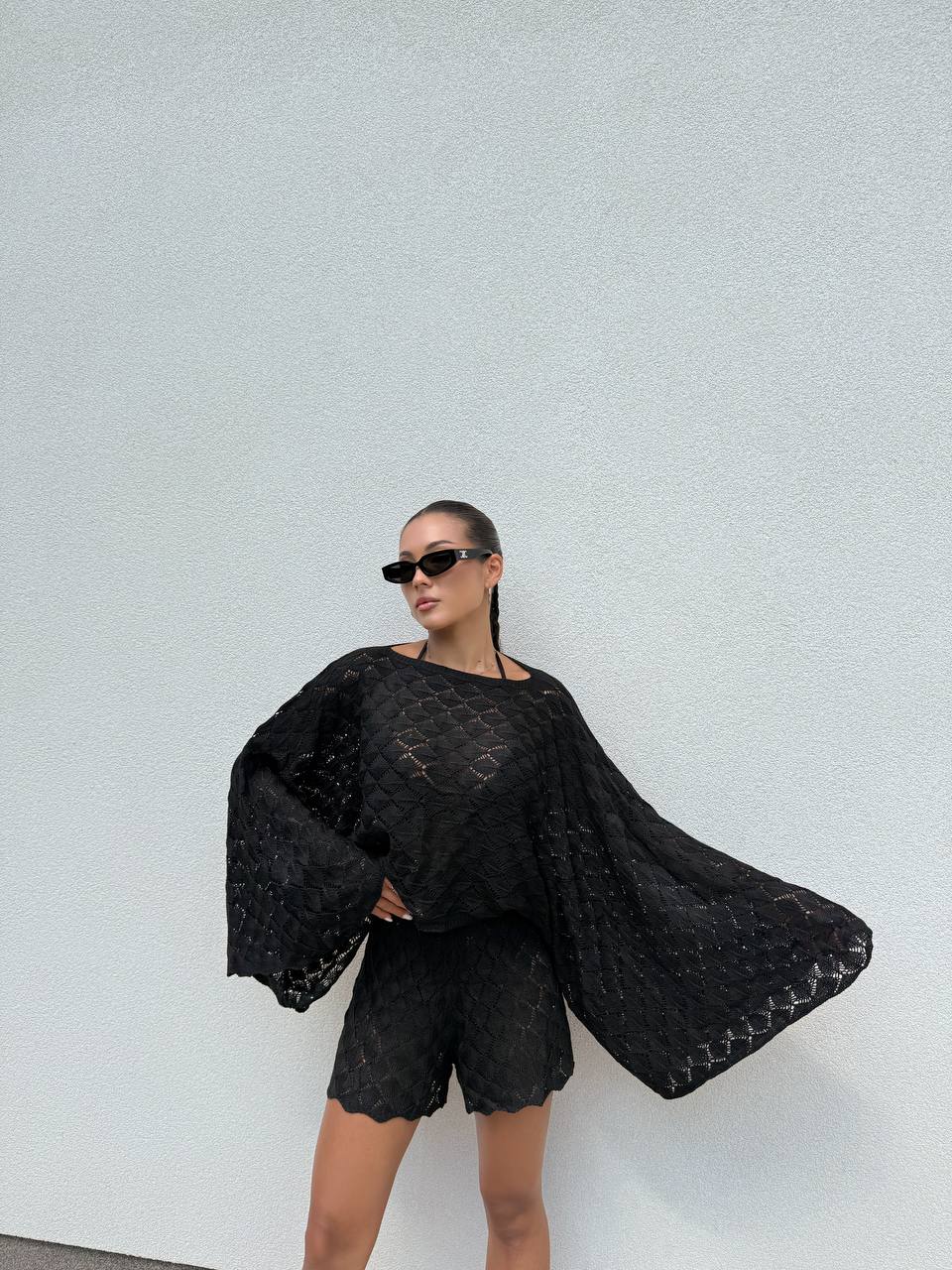 Жіночий Літній Пляжний В’язаний Чорний Костюм Вільного Крою з Широкими Рукавами (Кофта + Шорти)