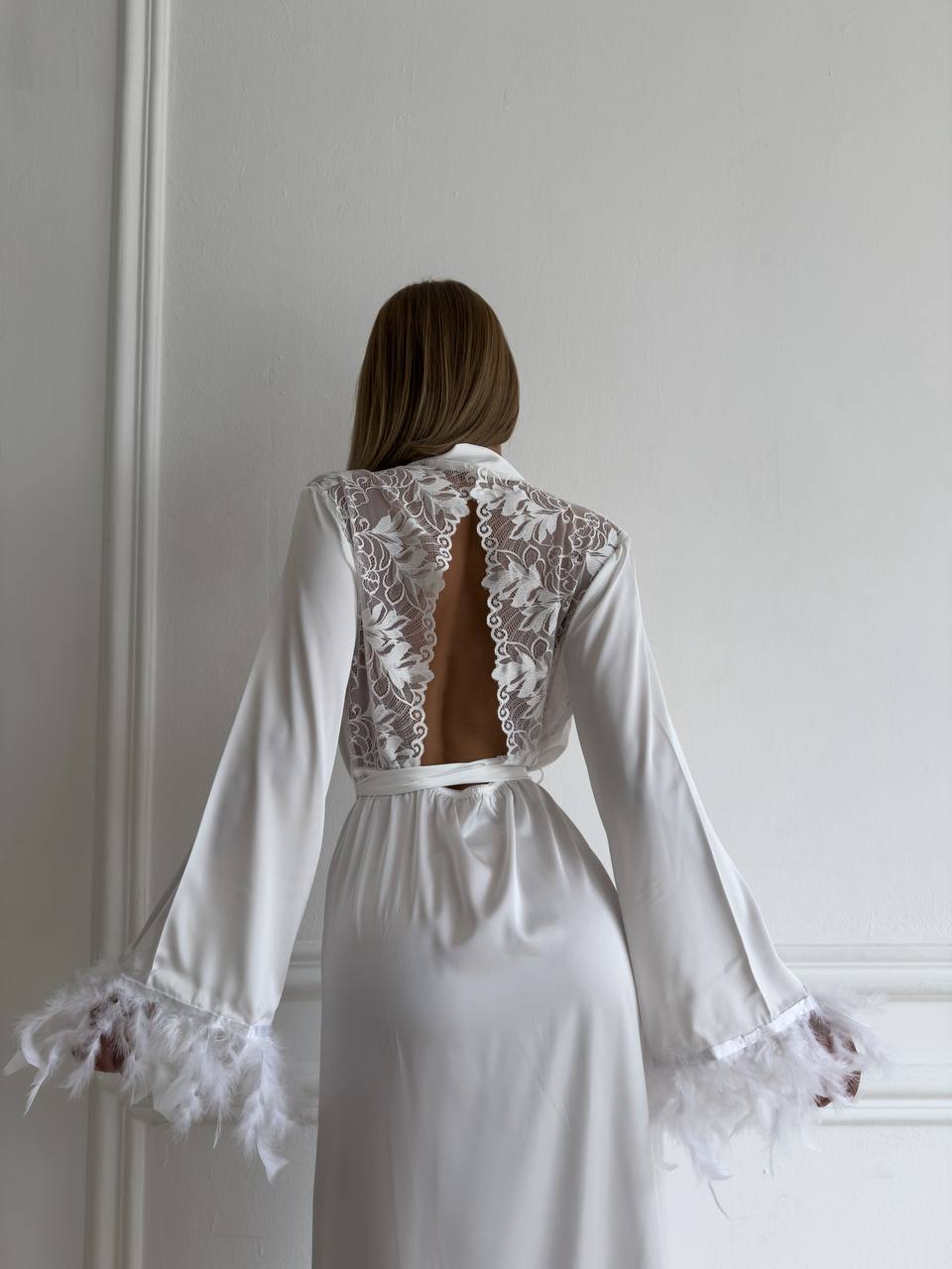 Жіночий Довгий Білий Атласний Халат із Пір’ям на Рукавах та Мереживною Спинкою