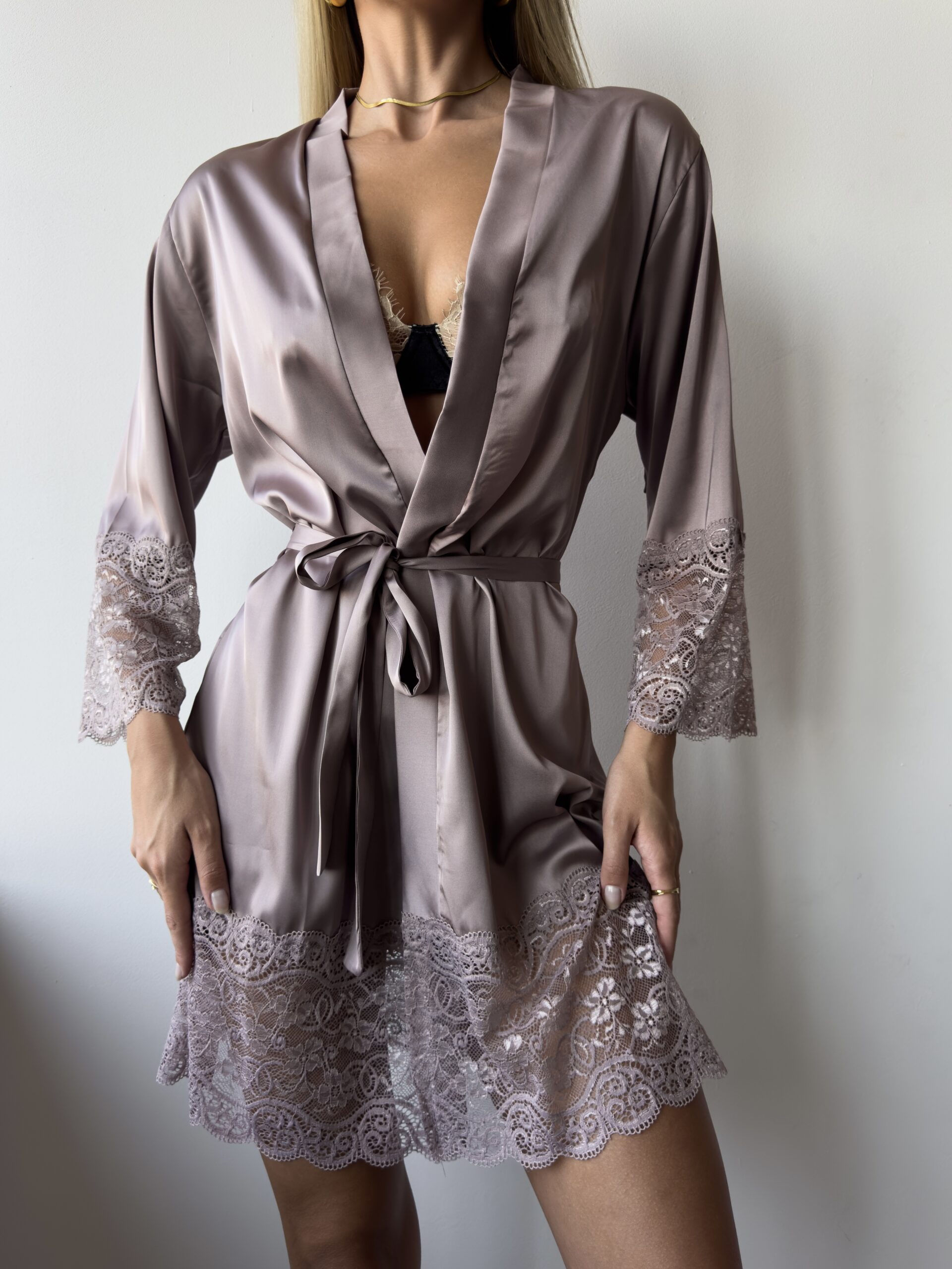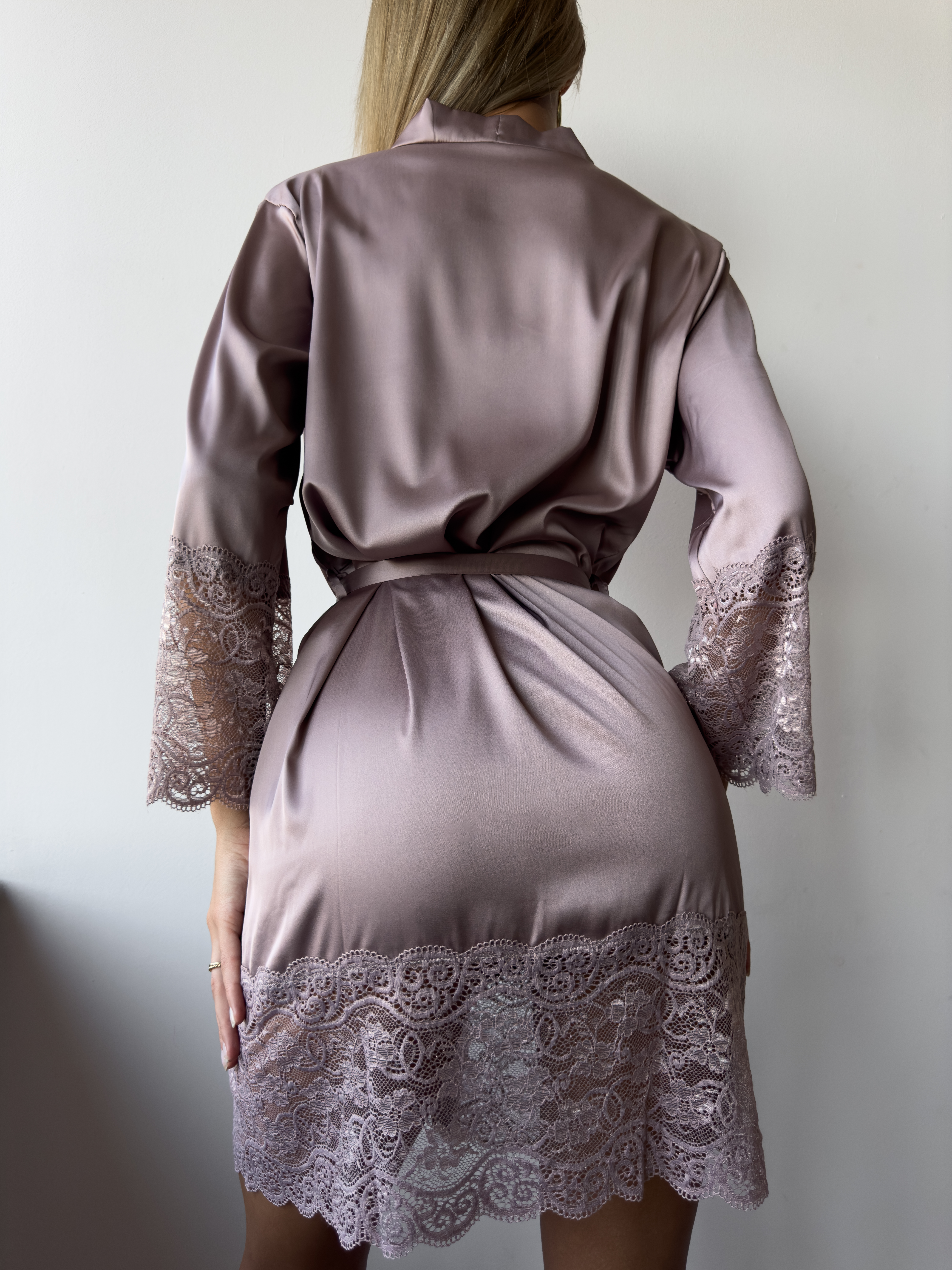 Жіночий Гладкий Халат Мокко під Пояс з Мереживом