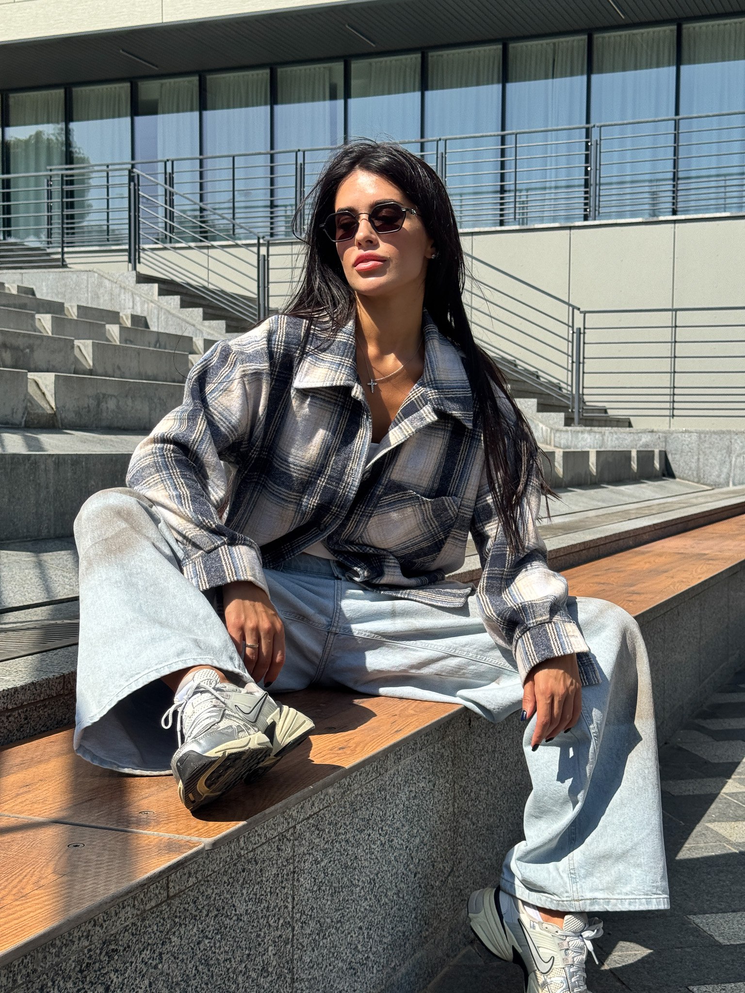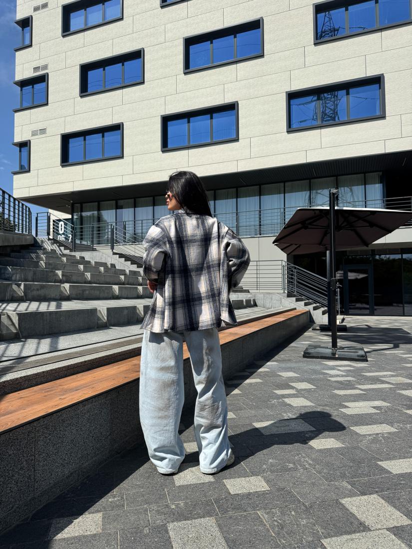 Жіноча Клітчаста Сіро-Бежева Сорочка Оверсайз на Ґудзиках