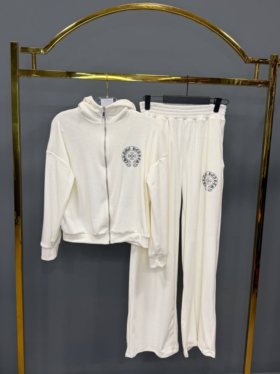 Жіночий Білий Велюровий Костюм – Зіп Кофта з Капюшоном + Широкі Штани