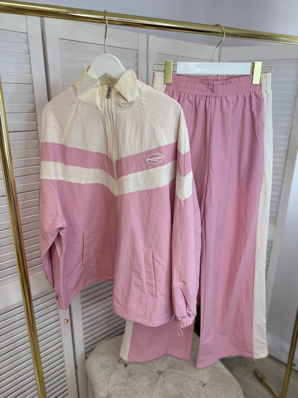 Жіночий Рожевий Спортивний Костюм Плащівка – Олімпійка на Блискавці + Широкі Штани з Лампасами
