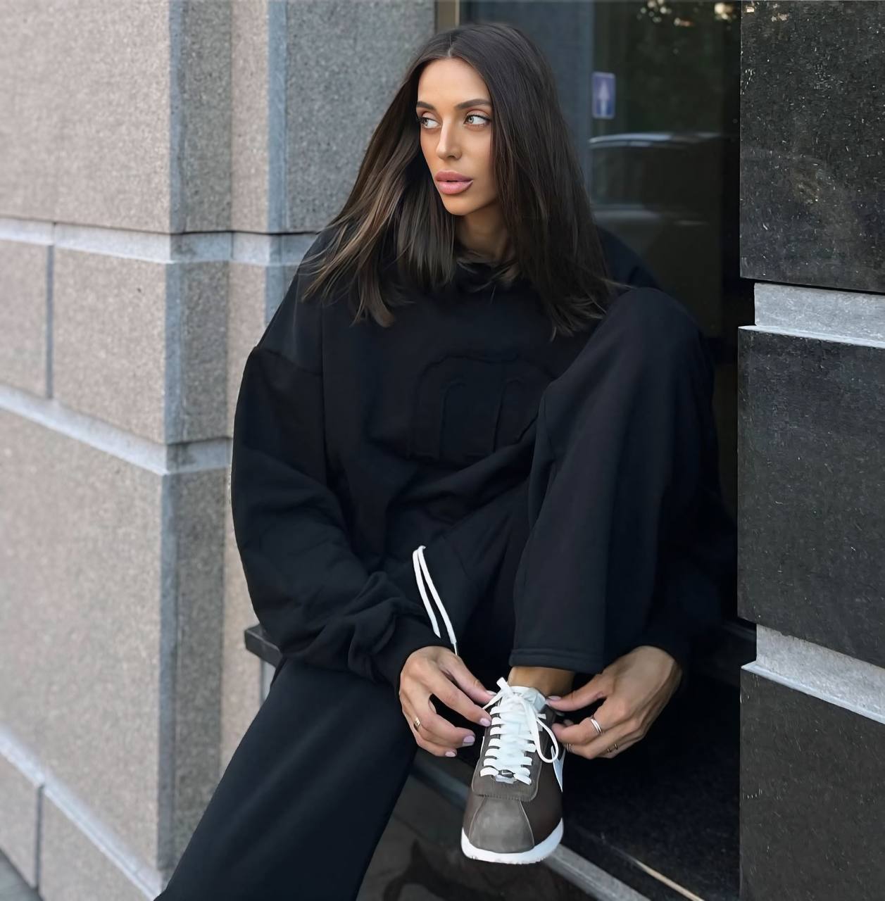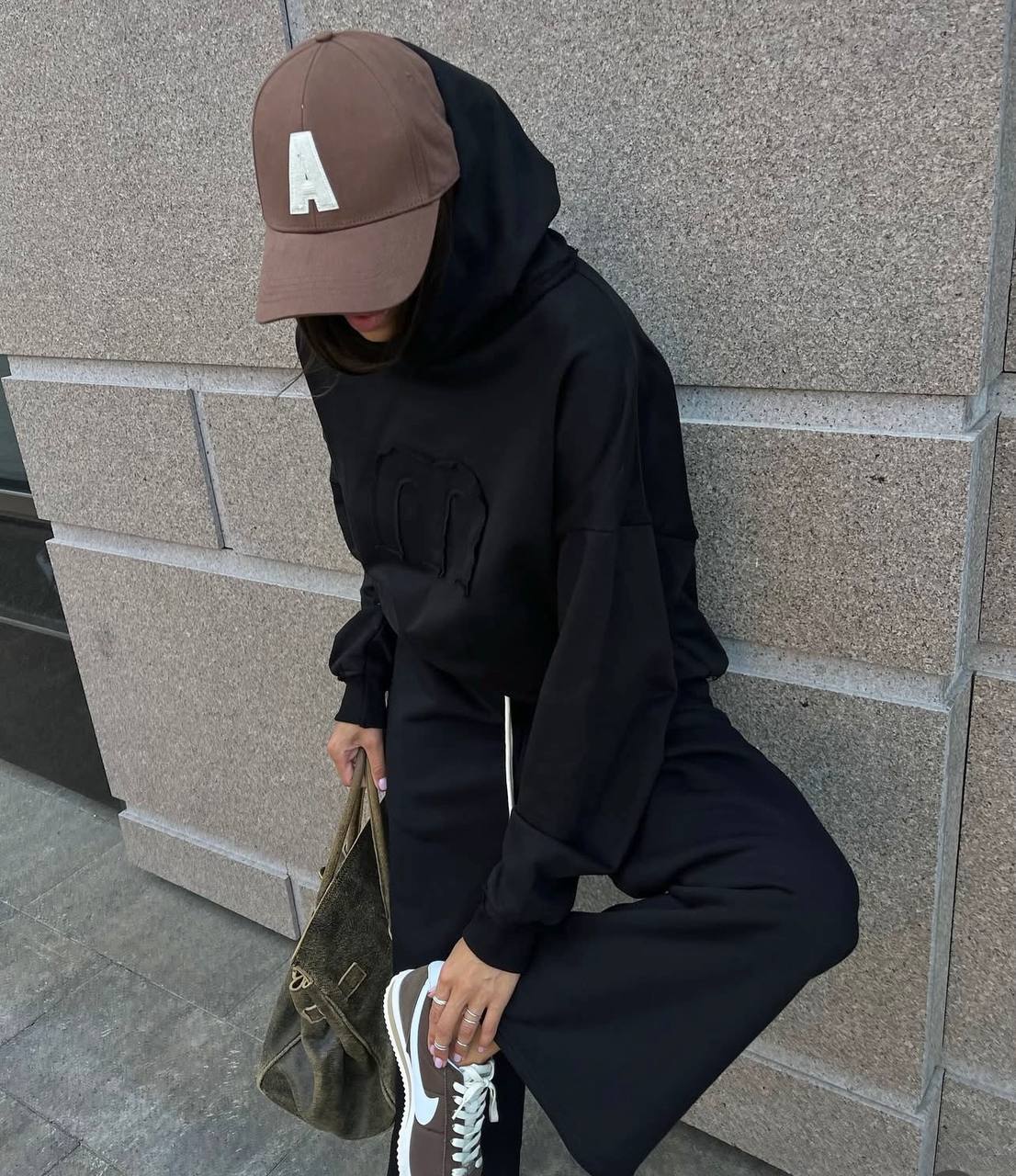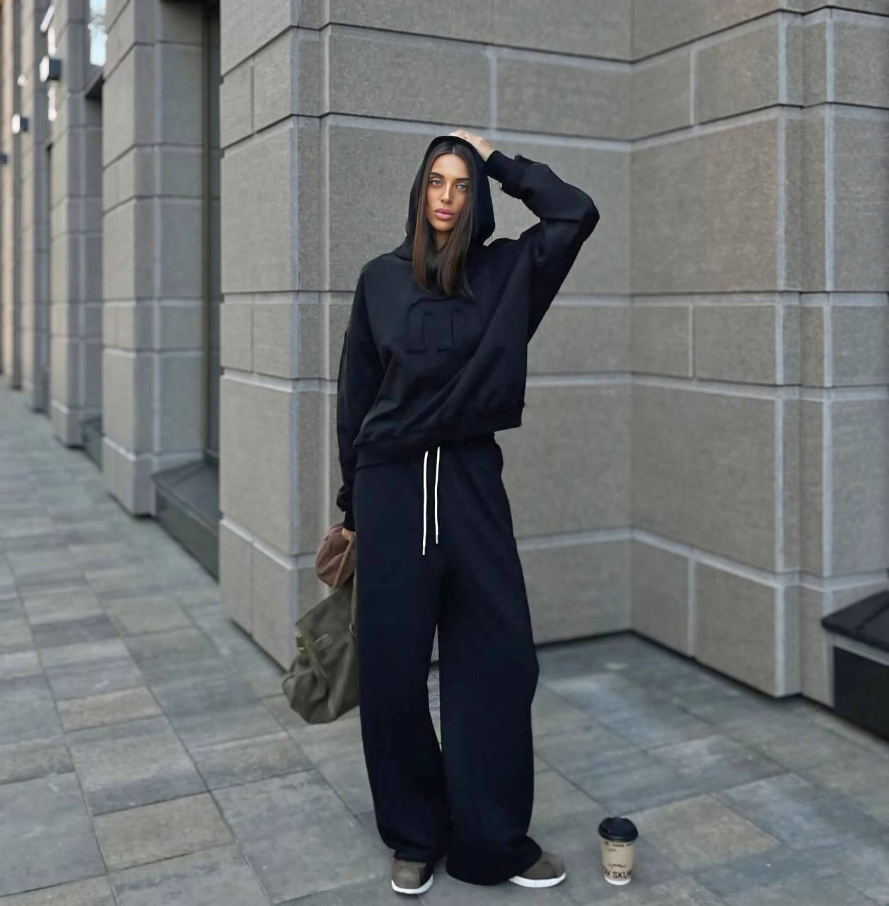 Жіночий Теплий Чорний Костюм Оверсайз на Флісі – Худі з Нашивкою + Широкі Штани
