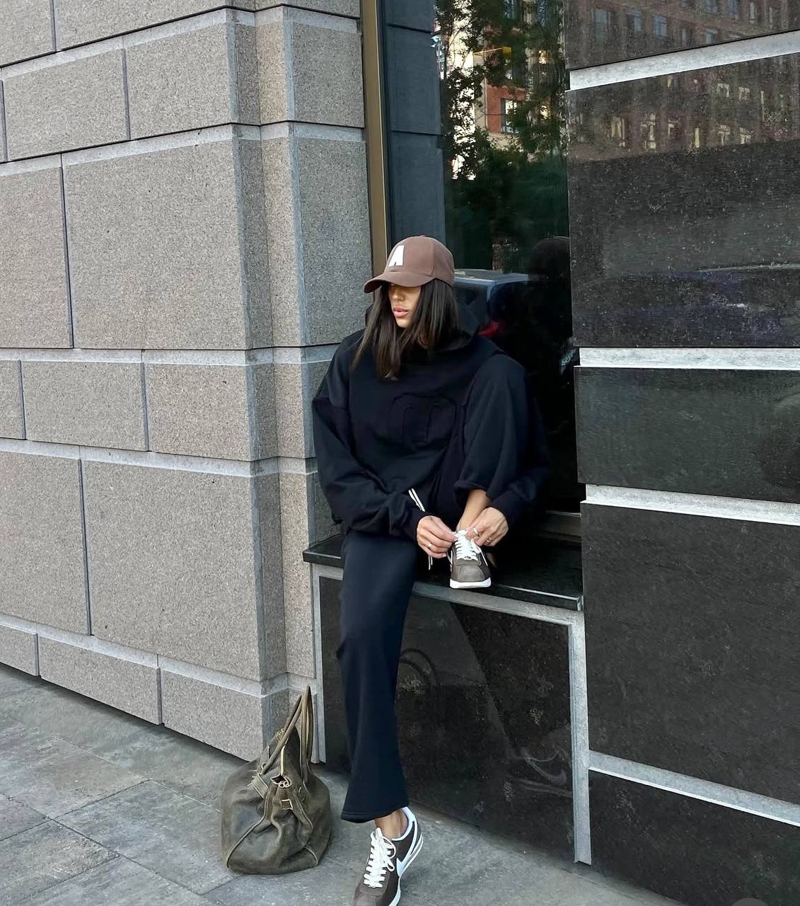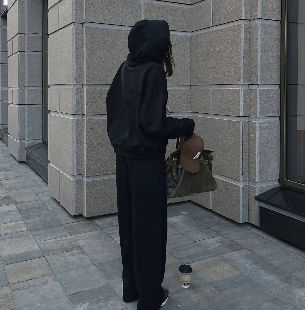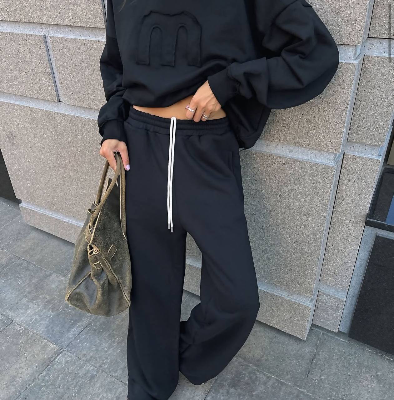 Жіночий Теплий Чорний Костюм Оверсайз на Флісі – Худі з Нашивкою + Широкі Штани