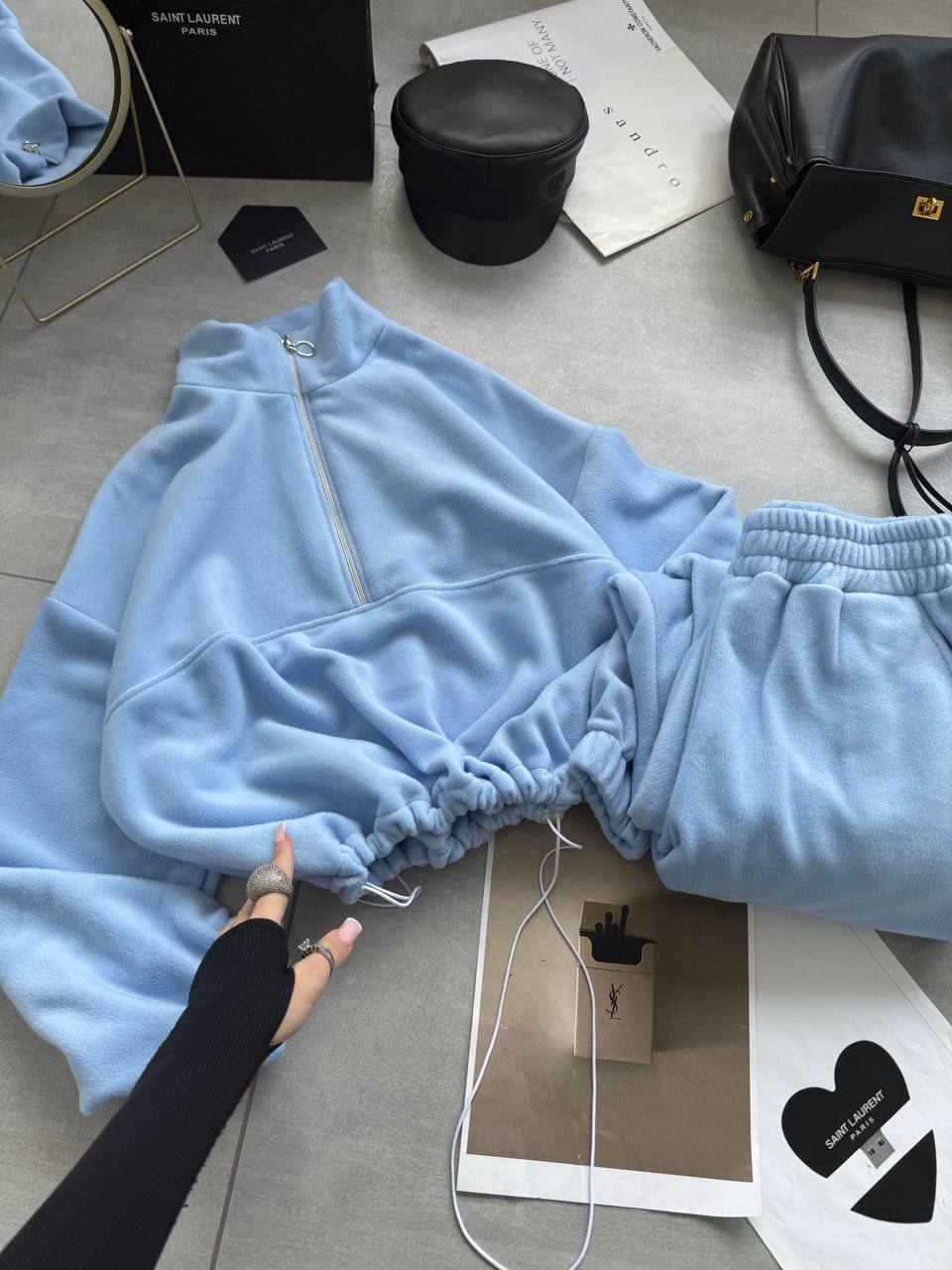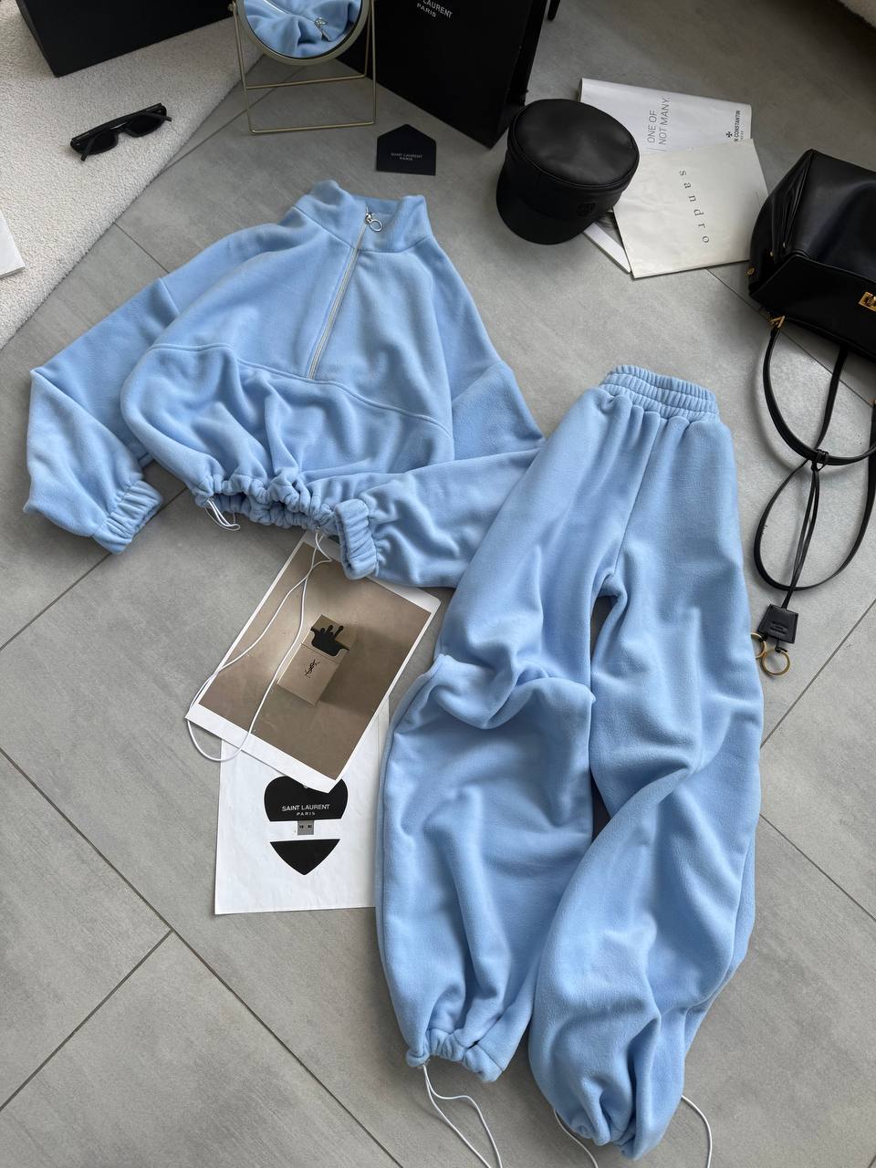 Жіночий Теплий Флісовий Блакитний Костюм на Затяжках Кулісках – Кофта з Коротким Замком + Вільні Штани
