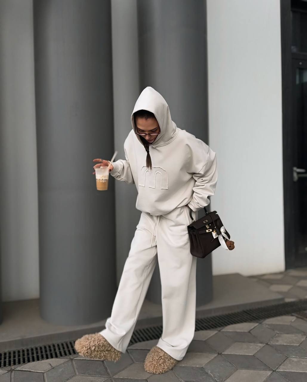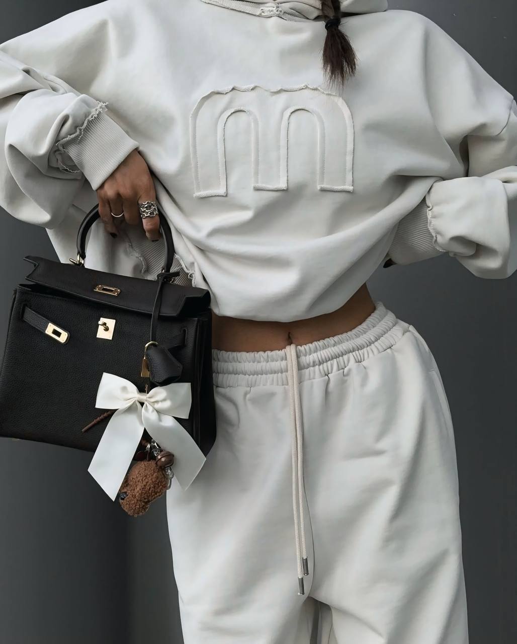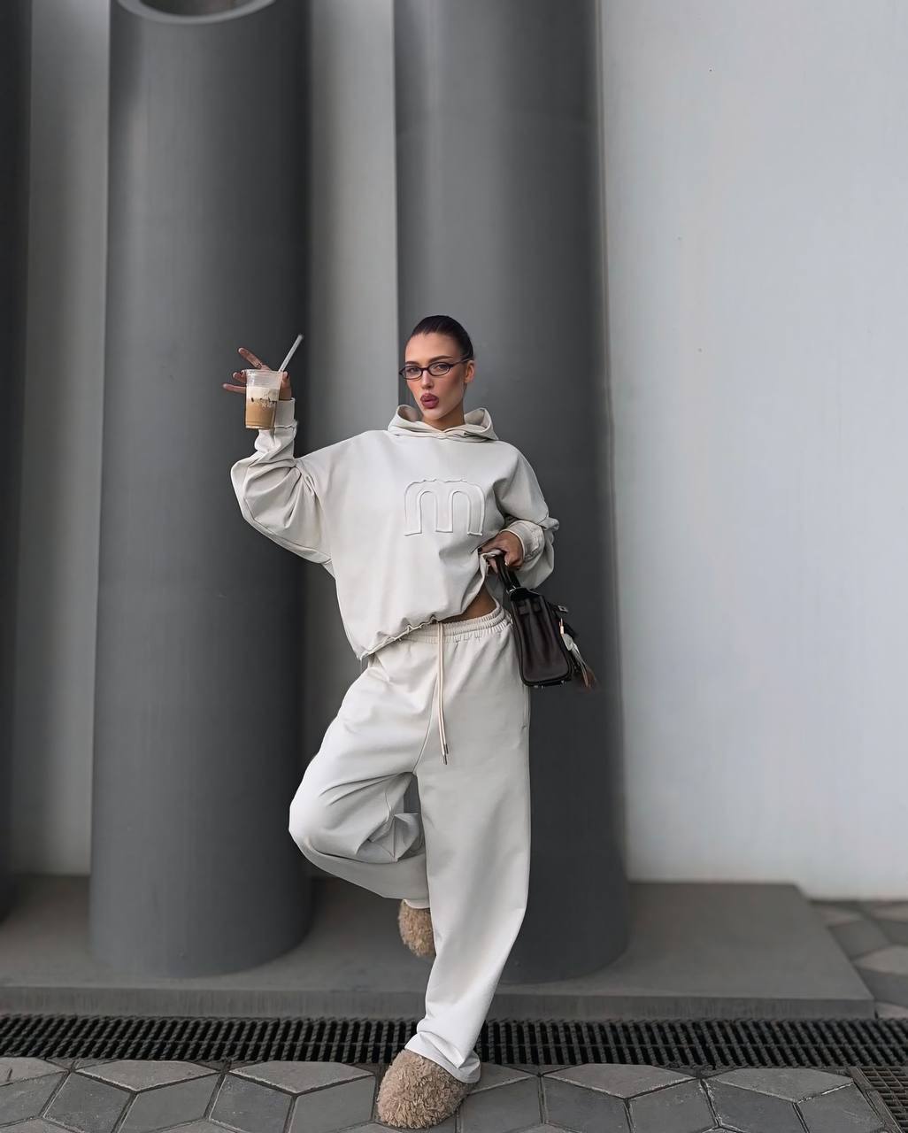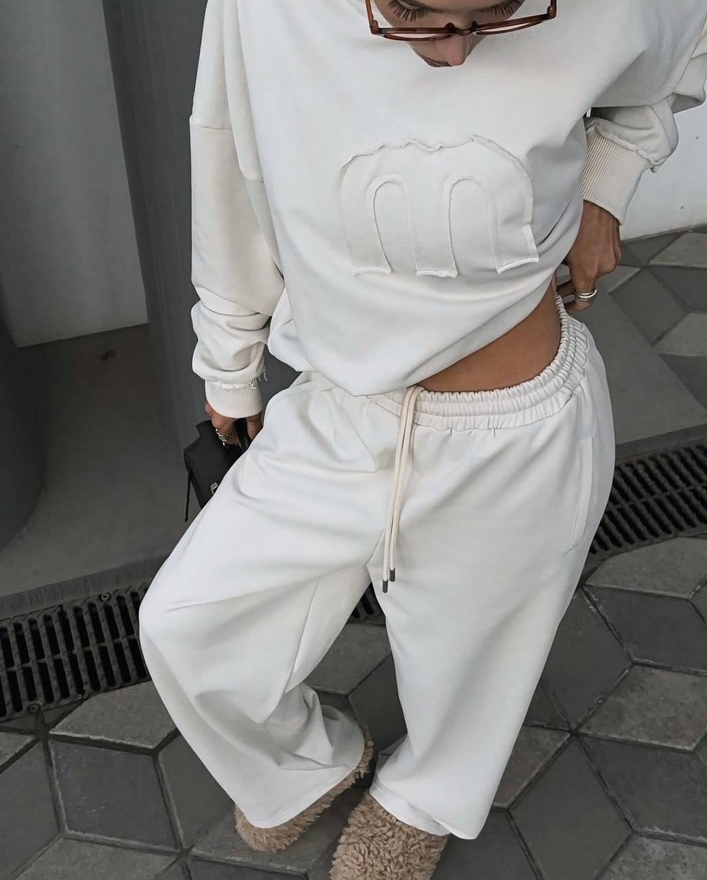 Жіночий Теплий Молочний Костюм Оверсайз на Флісі – Худі з Нашивкою + Широкі Штани