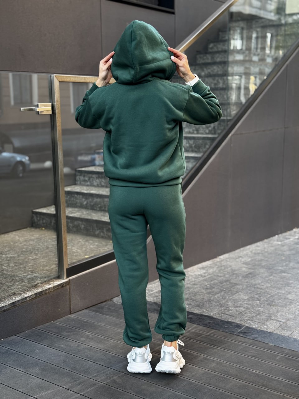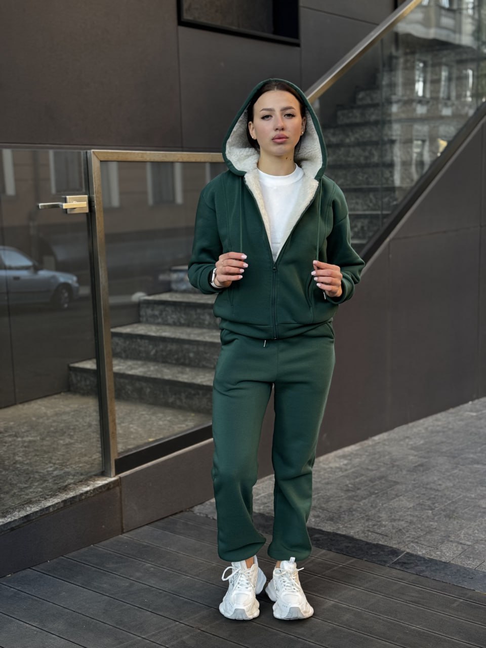 Жіночий Теплий Зелений Костюм на Хутрі з Флісом – Зіп Худі + Штани Джогери