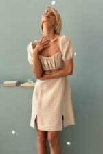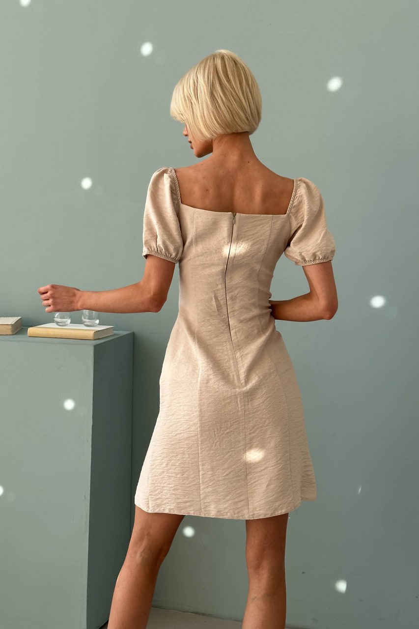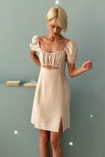 Жіноча Бежева Сукня Альфа Міні з Короткими Рукавами та Вирізом Під Грудьми