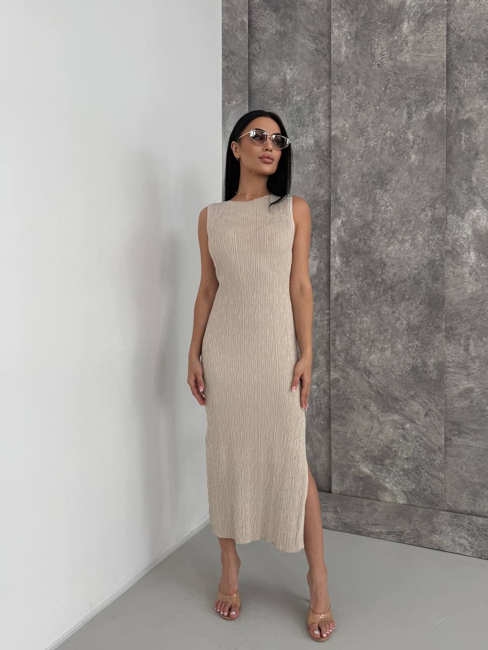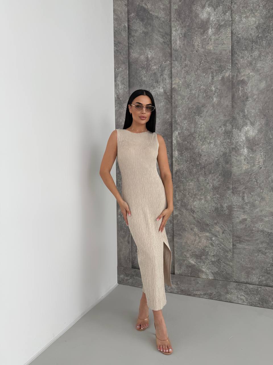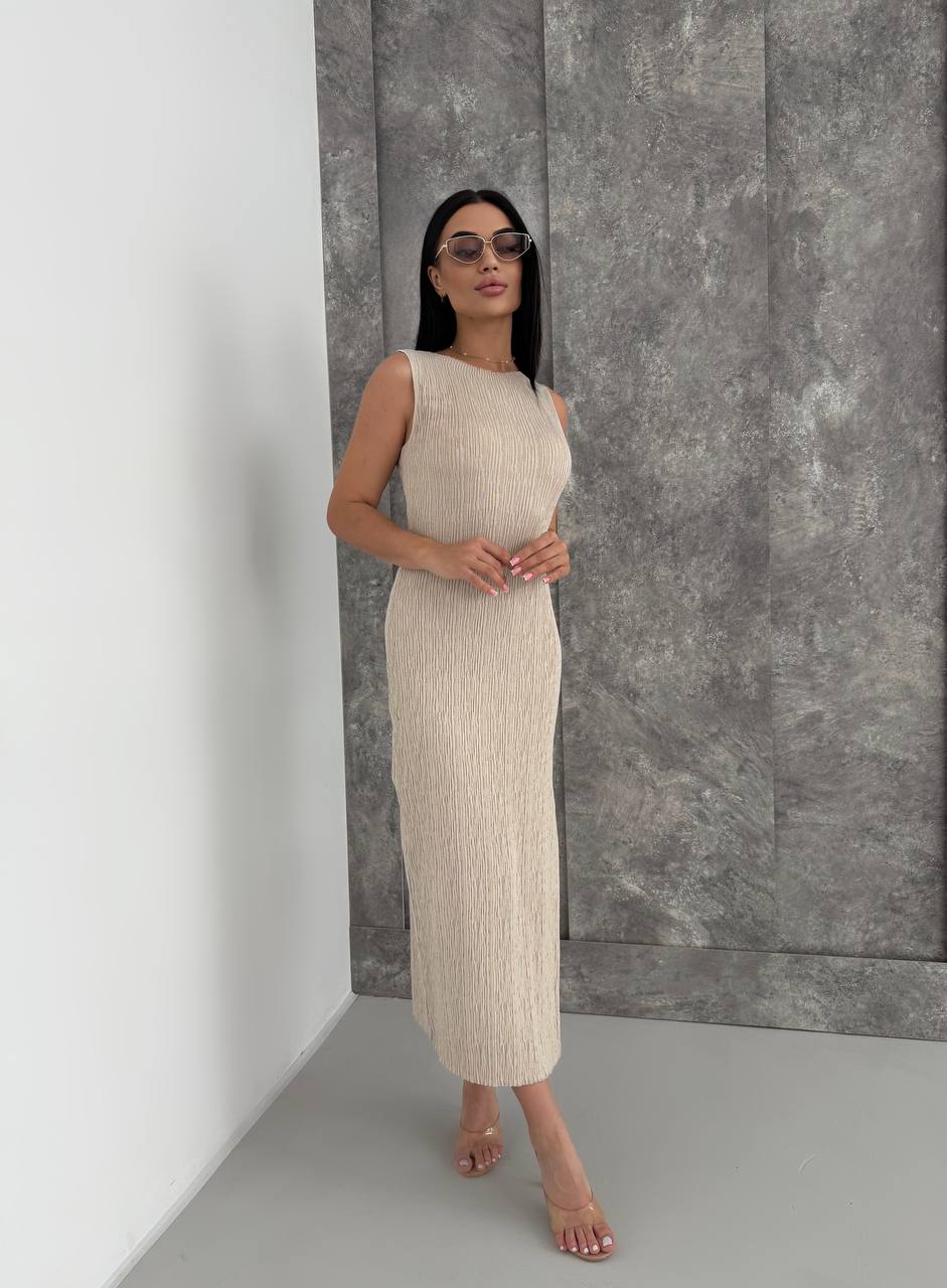 Жіноча Бежева Сукня Максі Приталеного Крою без Рукавів з Розрізом Збоку