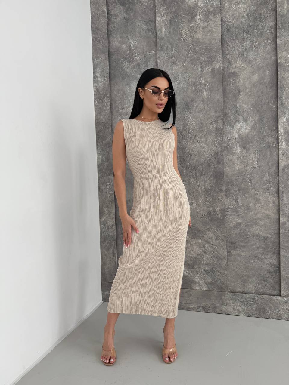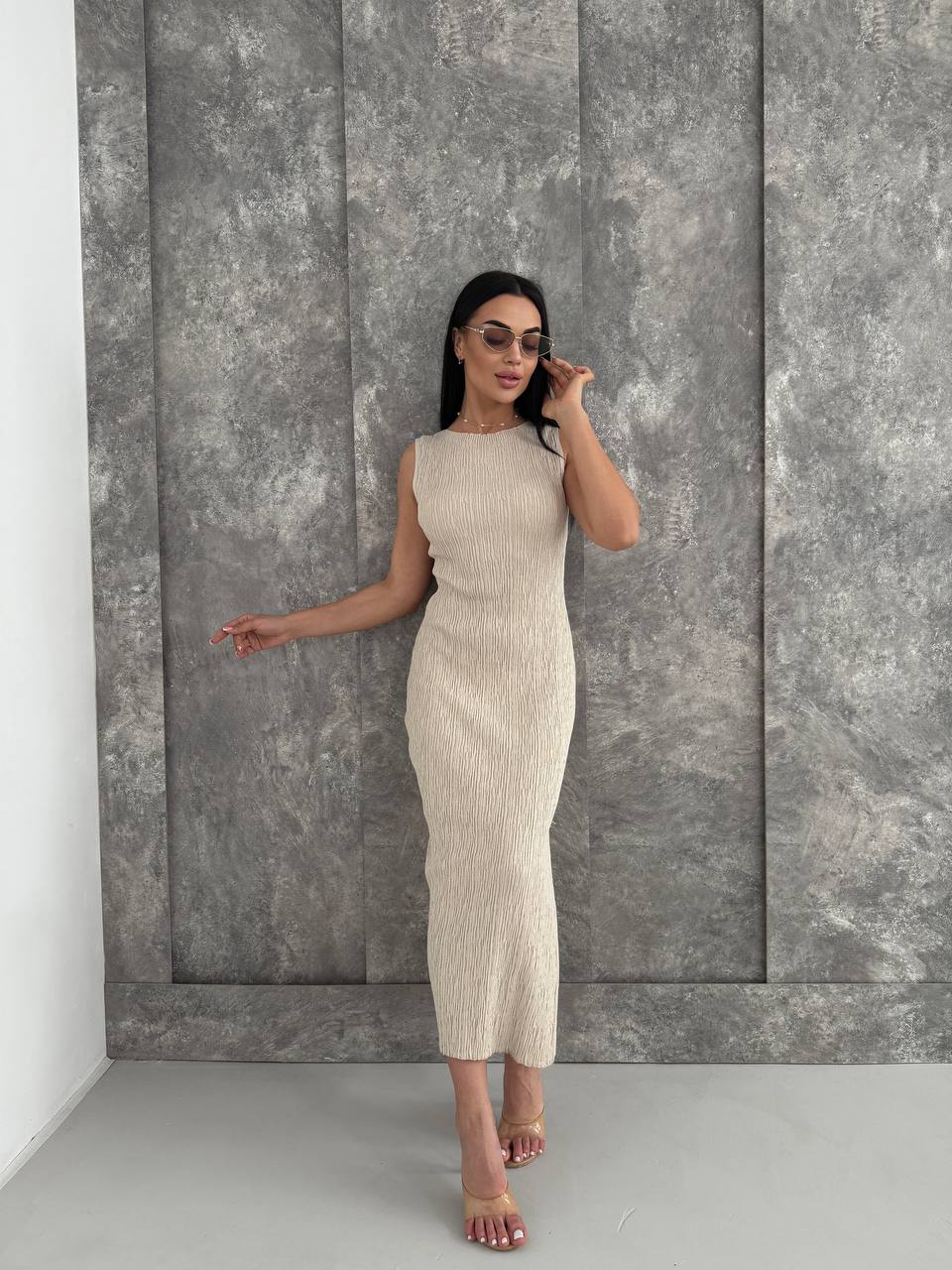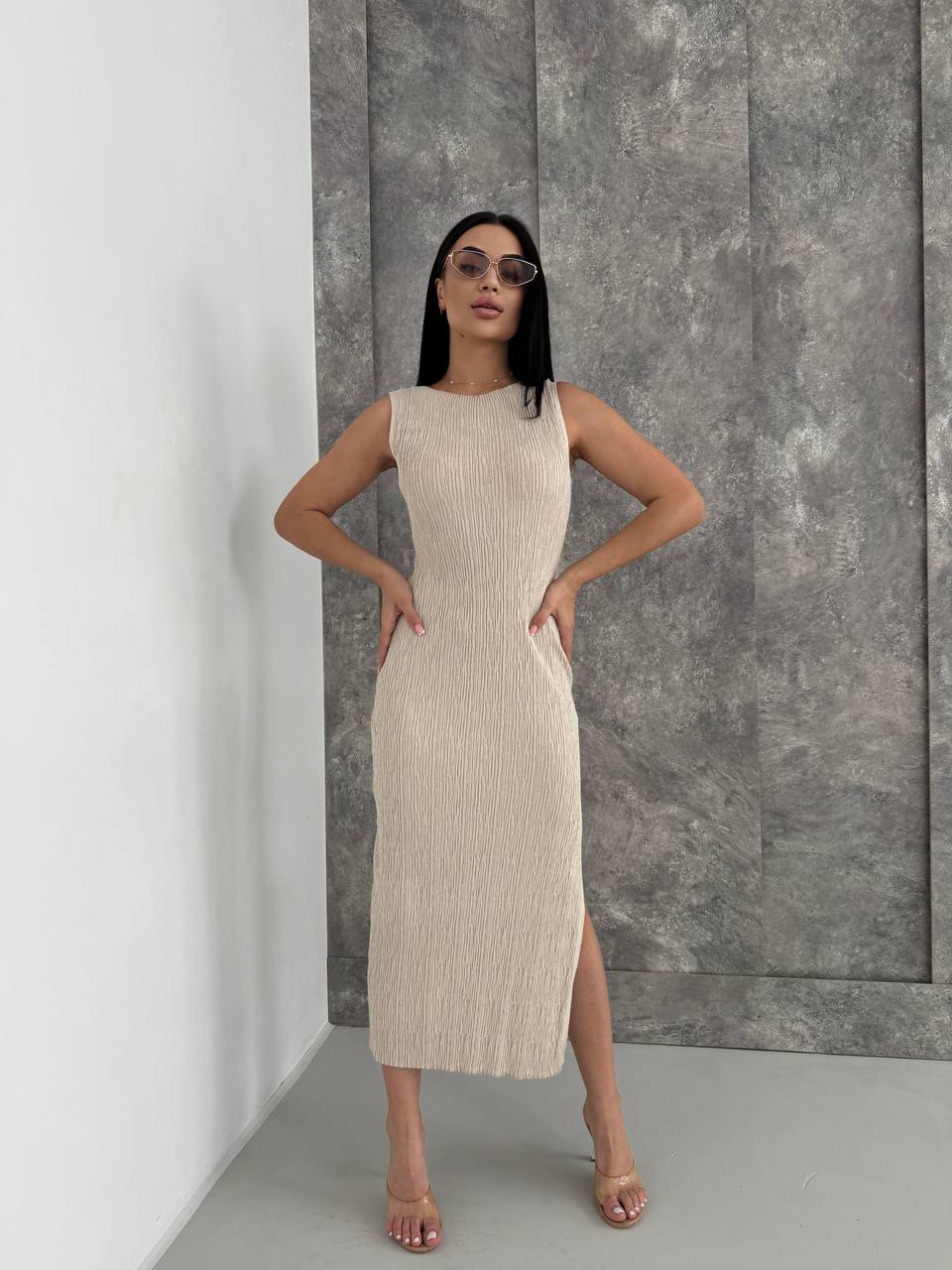 Жіноча Бежева Сукня Максі Приталеного Крою без Рукавів з Розрізом Збоку
