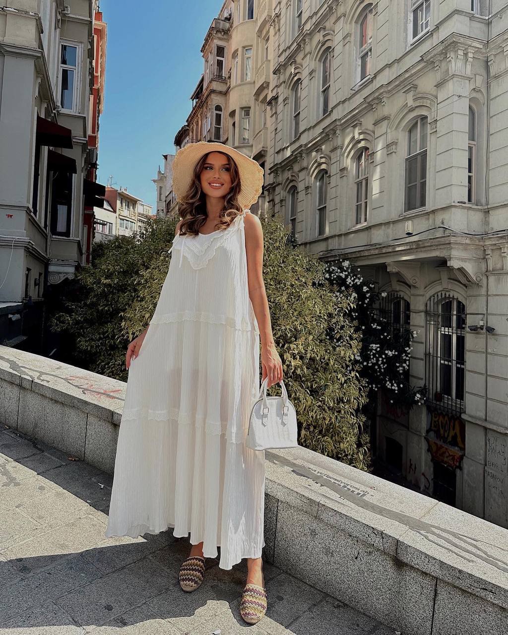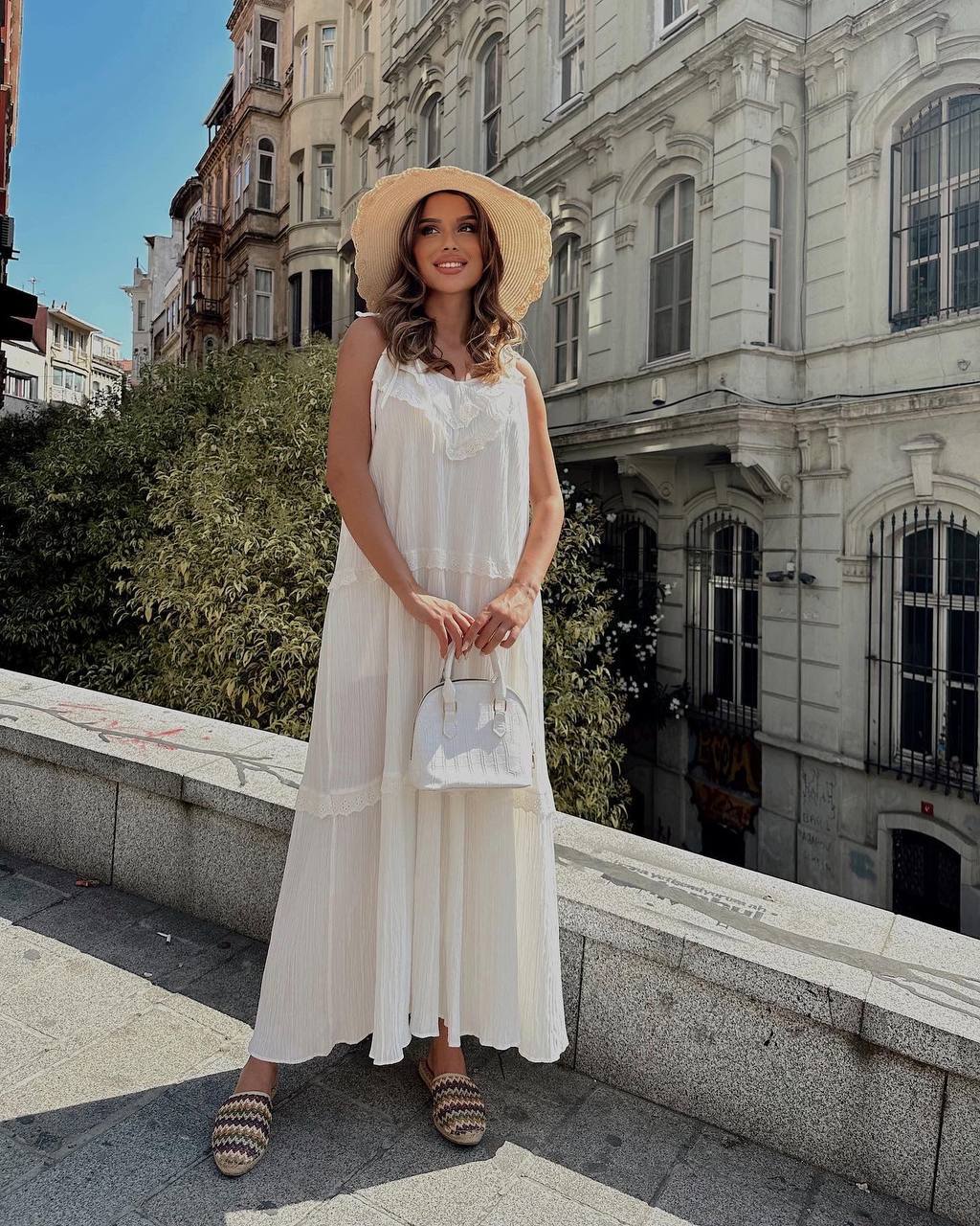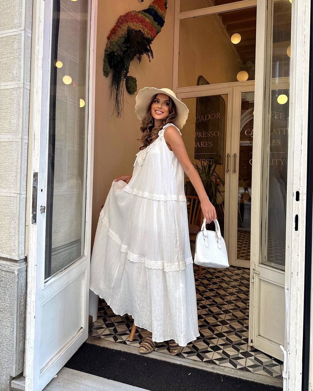 Жіноча Біла Сукня Сарафан Максі з Бретелями на Зав’язках та Багатоярусною Спідницею