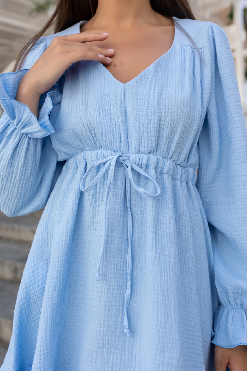 Жіноча Блакитна Сукня Джелі Міні – Легка Муслінова з Рюшами та Затяжкою на Талії