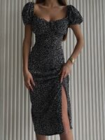 Будьте першим, хто залишив відгук “Жіноча Чорна Сукня Міді в Прінт – Довга з Фігурним Вирізом Декольте та Короткими Рукавами”“ Скасувати коментар