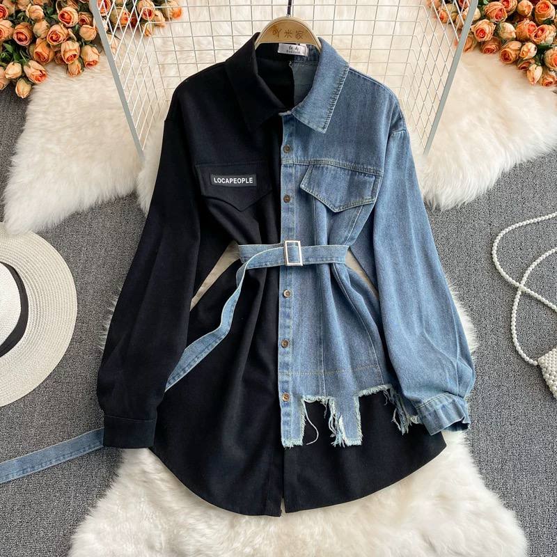 Жіноча Чорна Сукня-Сорочка з Джинсовою Вставкою та Поясом