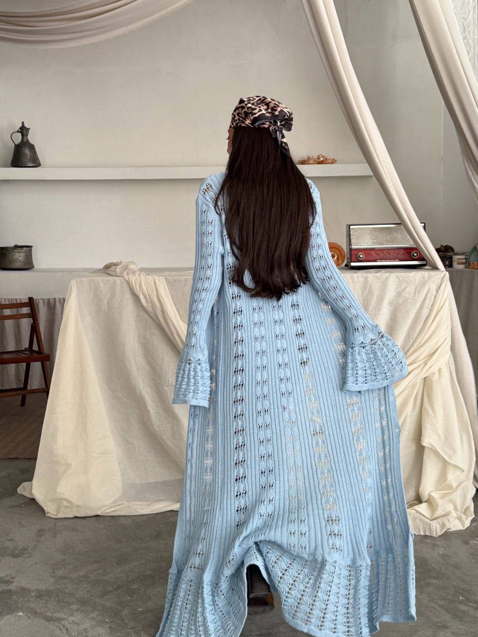 Жіноча Довга Ажурна Блакитна Сукня на Ґудзиках з Глибоким Вирізом та Рукавами Кльош