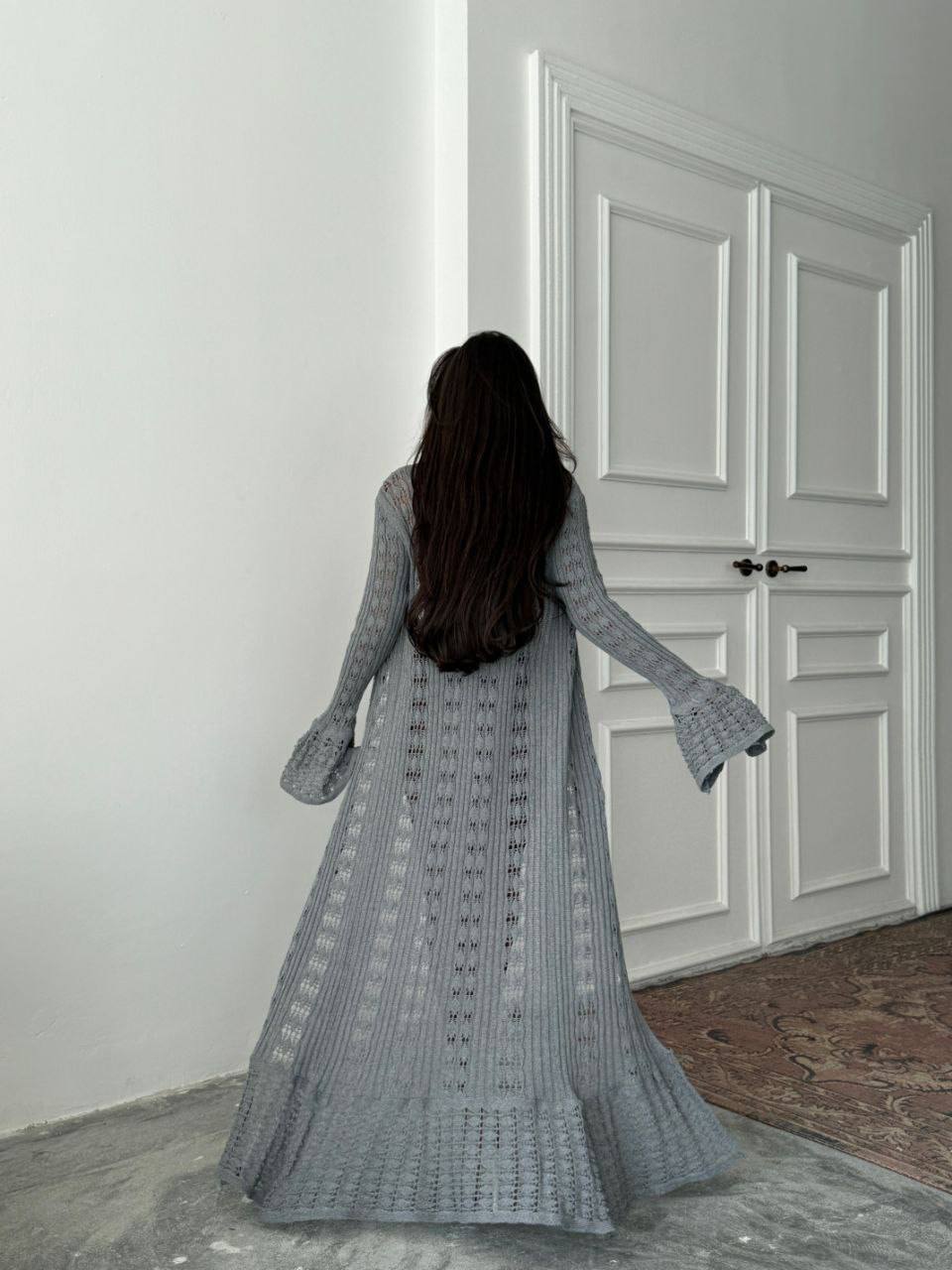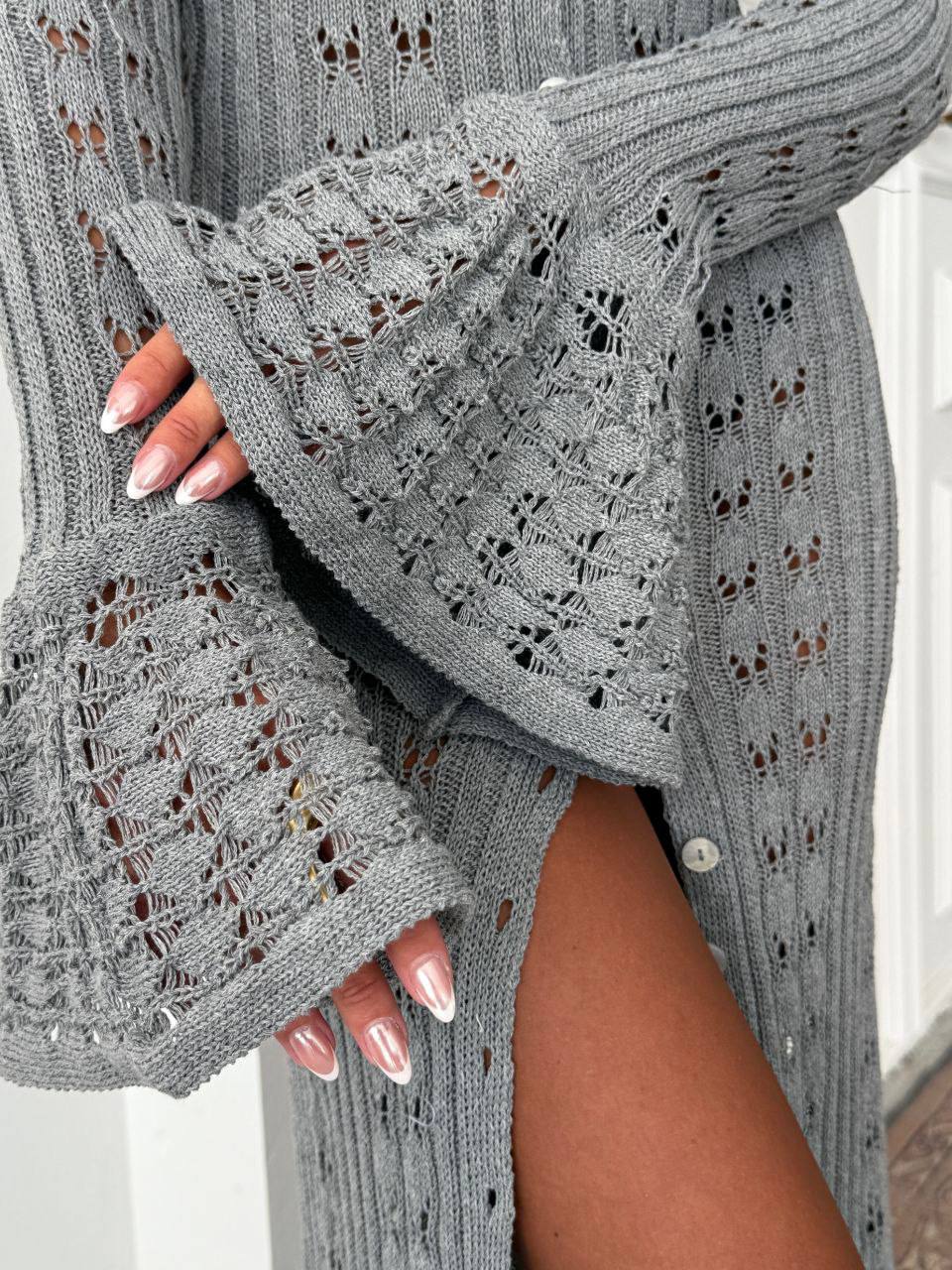 Жіноча Довга Ажурна Сіра Сукня на Ґудзиках з Глибоким Вирізом та Рукавами Кльош