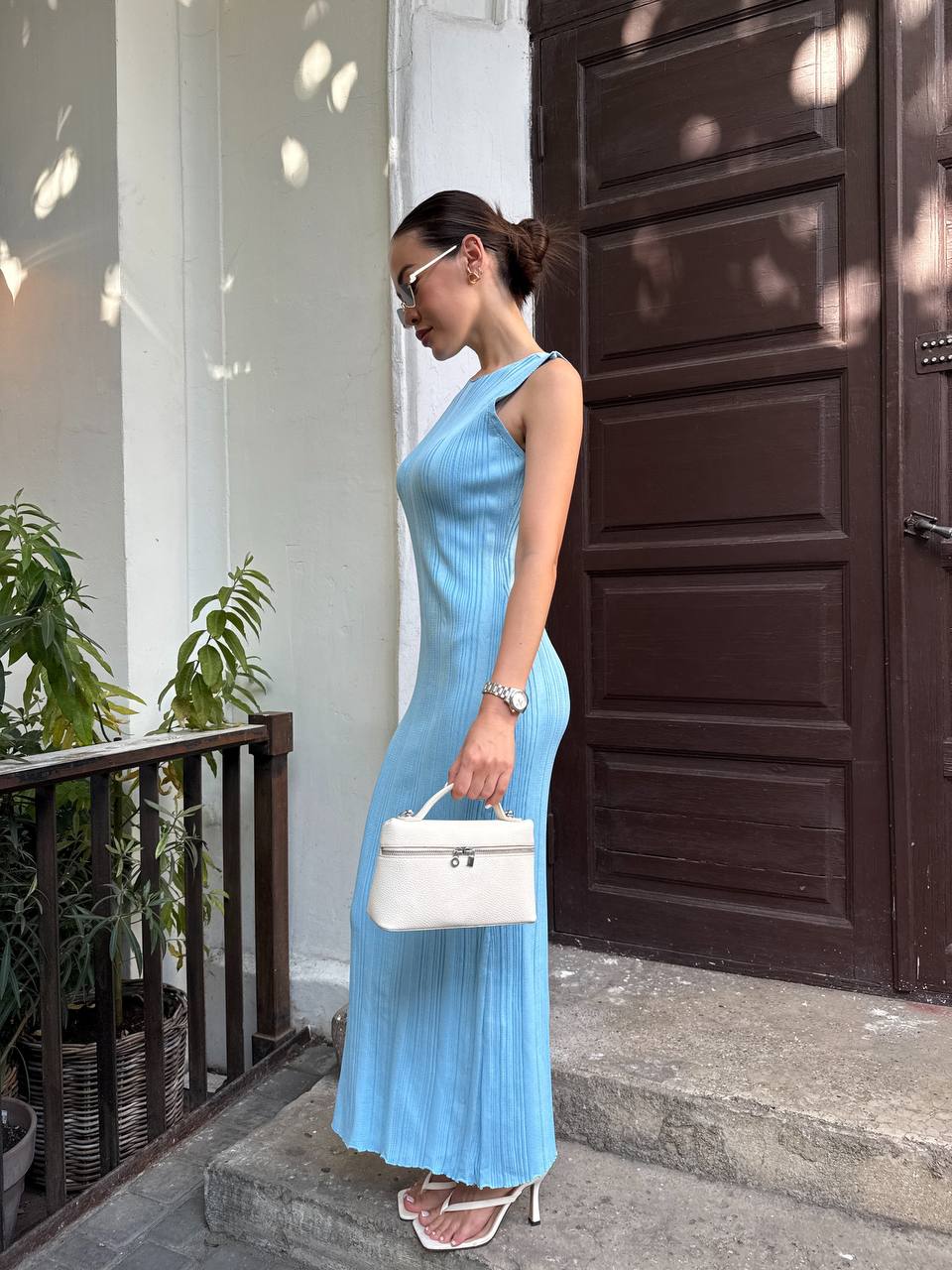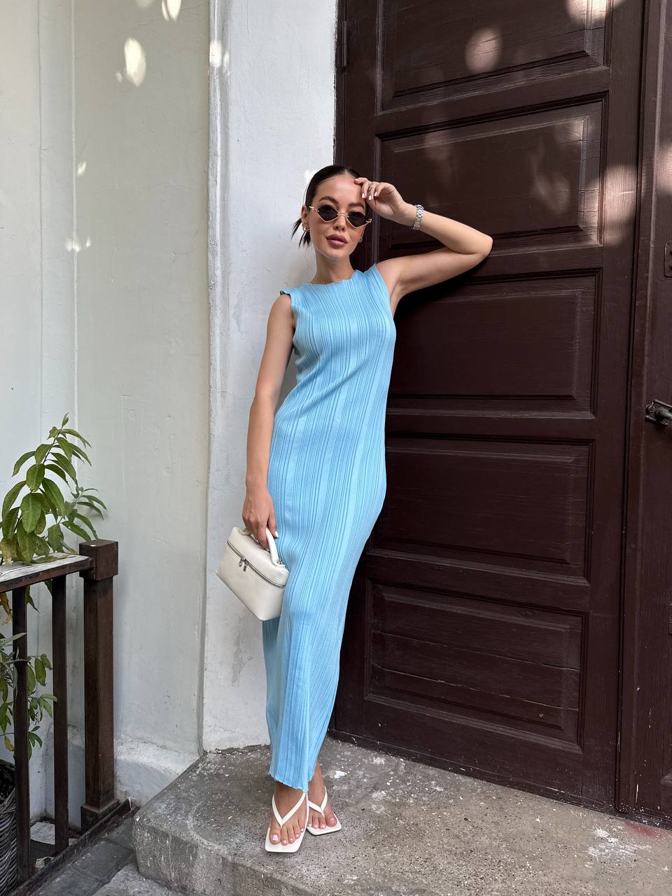 Жіноча Довга Блакитна Сукня Максі без Рукавів у Фактурну Смужку