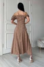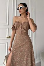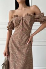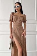Жіноча Довга Кавова Сукня Амбі Максі – в Принт Дрібних Квіточках з Розрізом Рюшами та Короткими Рукавами