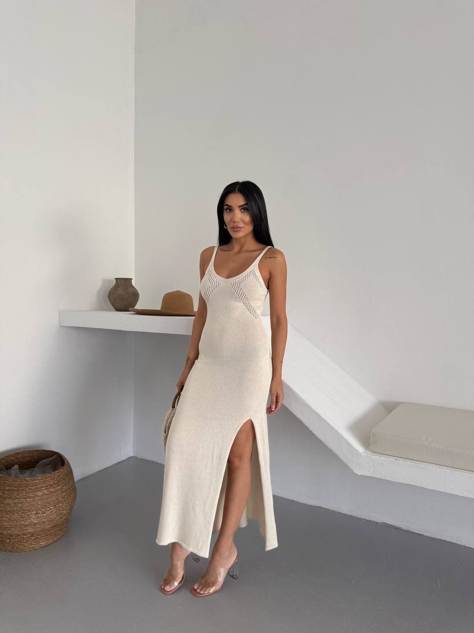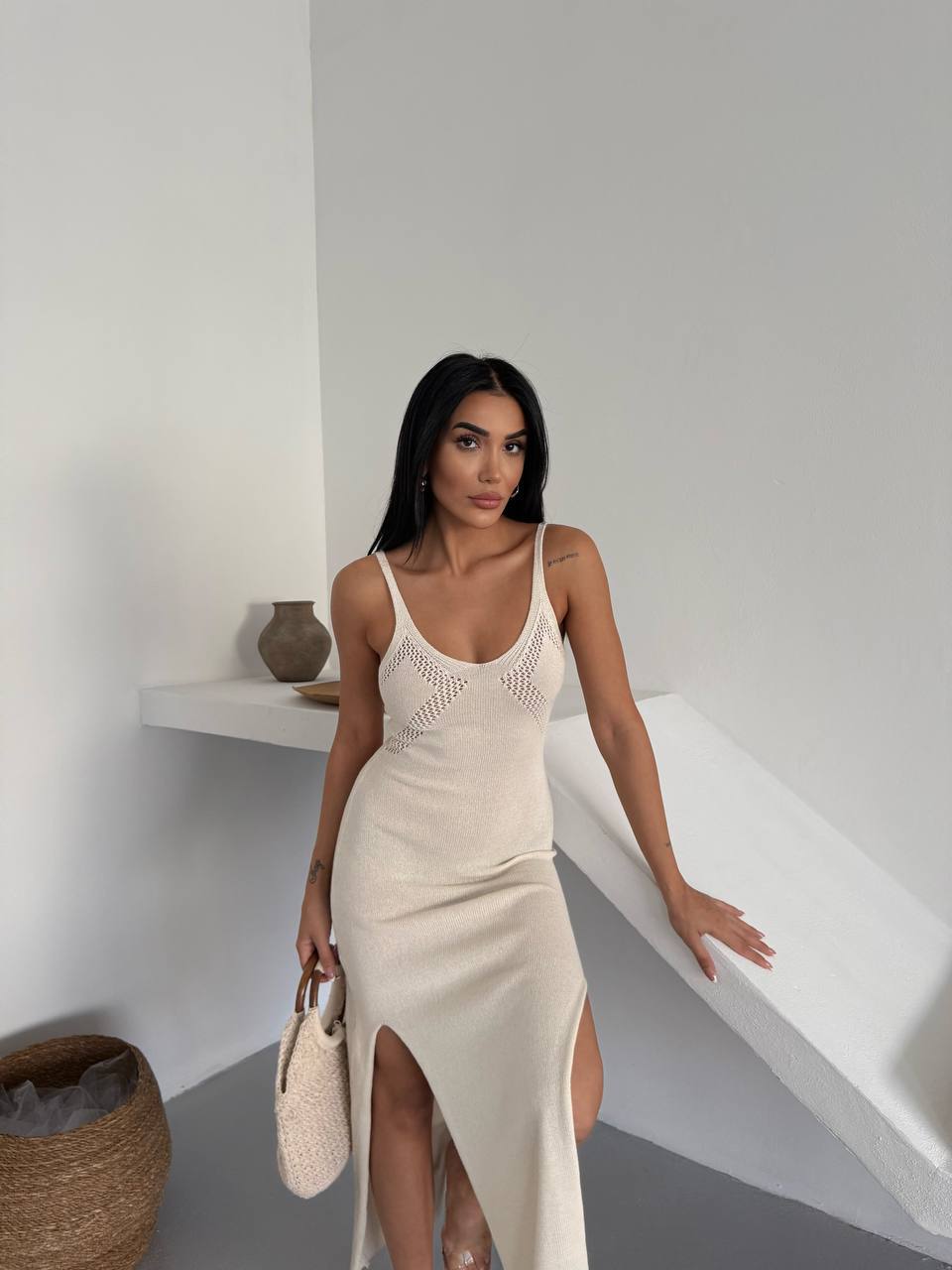 Жіноча Довга Літня Бежева Сукня з Глибоким Декольте та Розрізами на Ногах