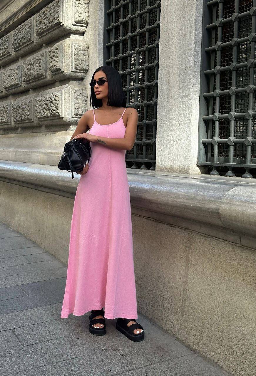 Жіноча Довга Літня Рожева Сукня Вільного Крою на Тонких Бретелях
