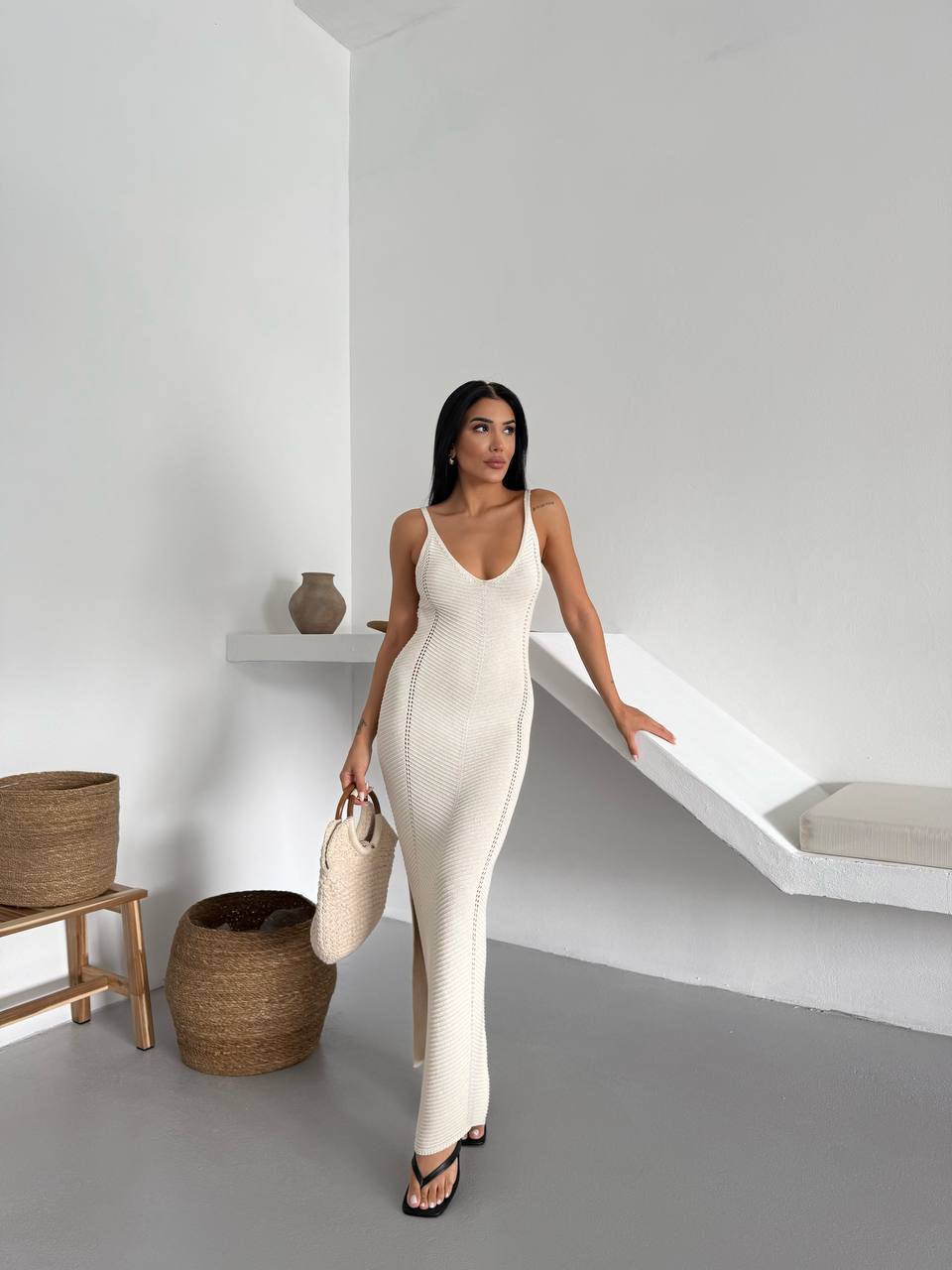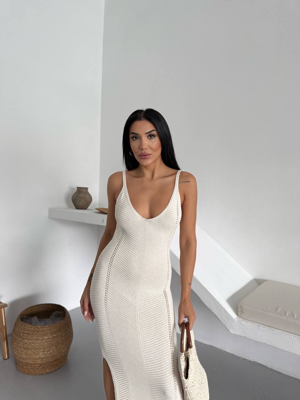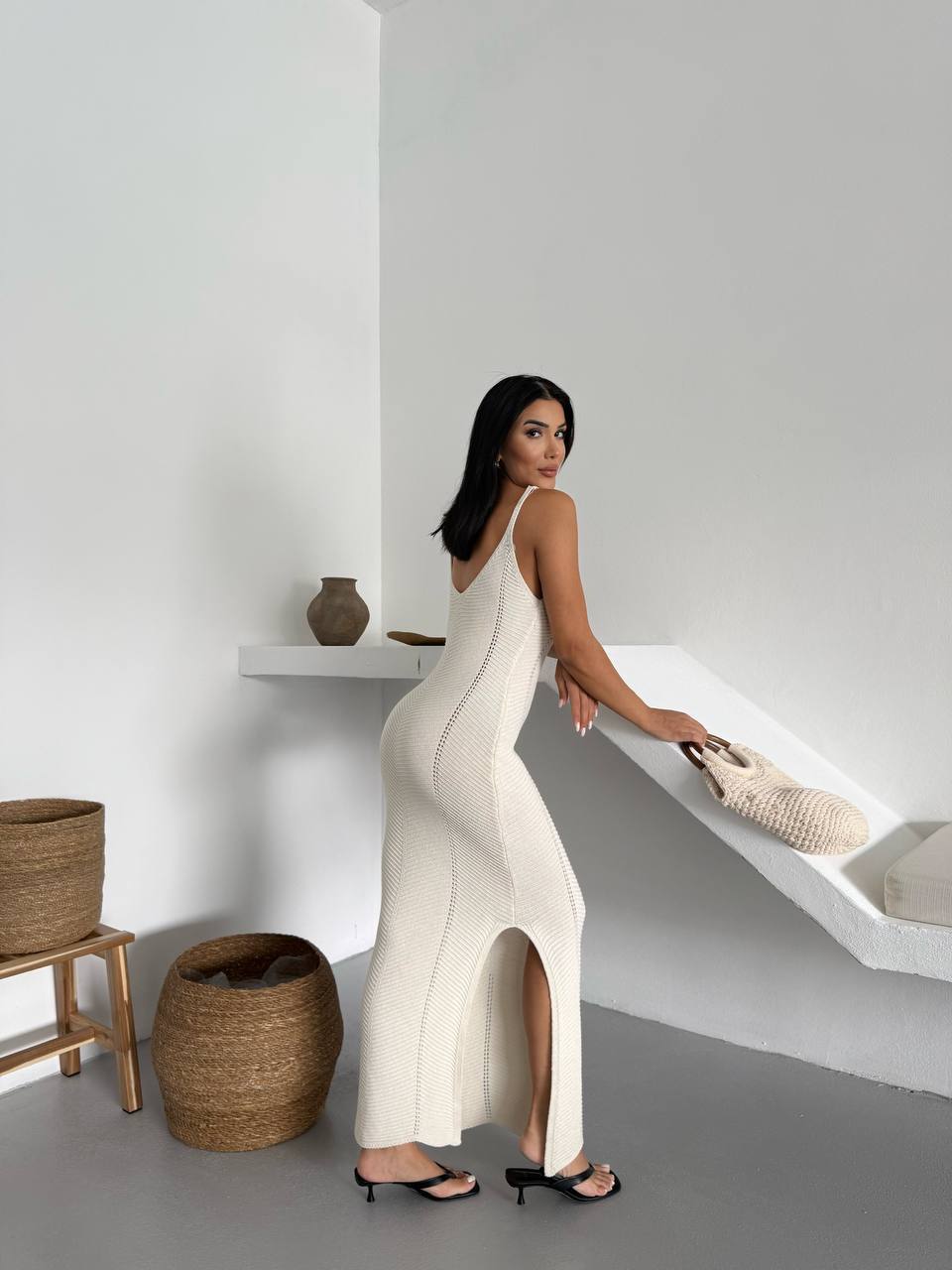 Жіноча Довга Літня Силуетна Бежева Сукня з Глибоким Вирізом та Розрізом Збоку