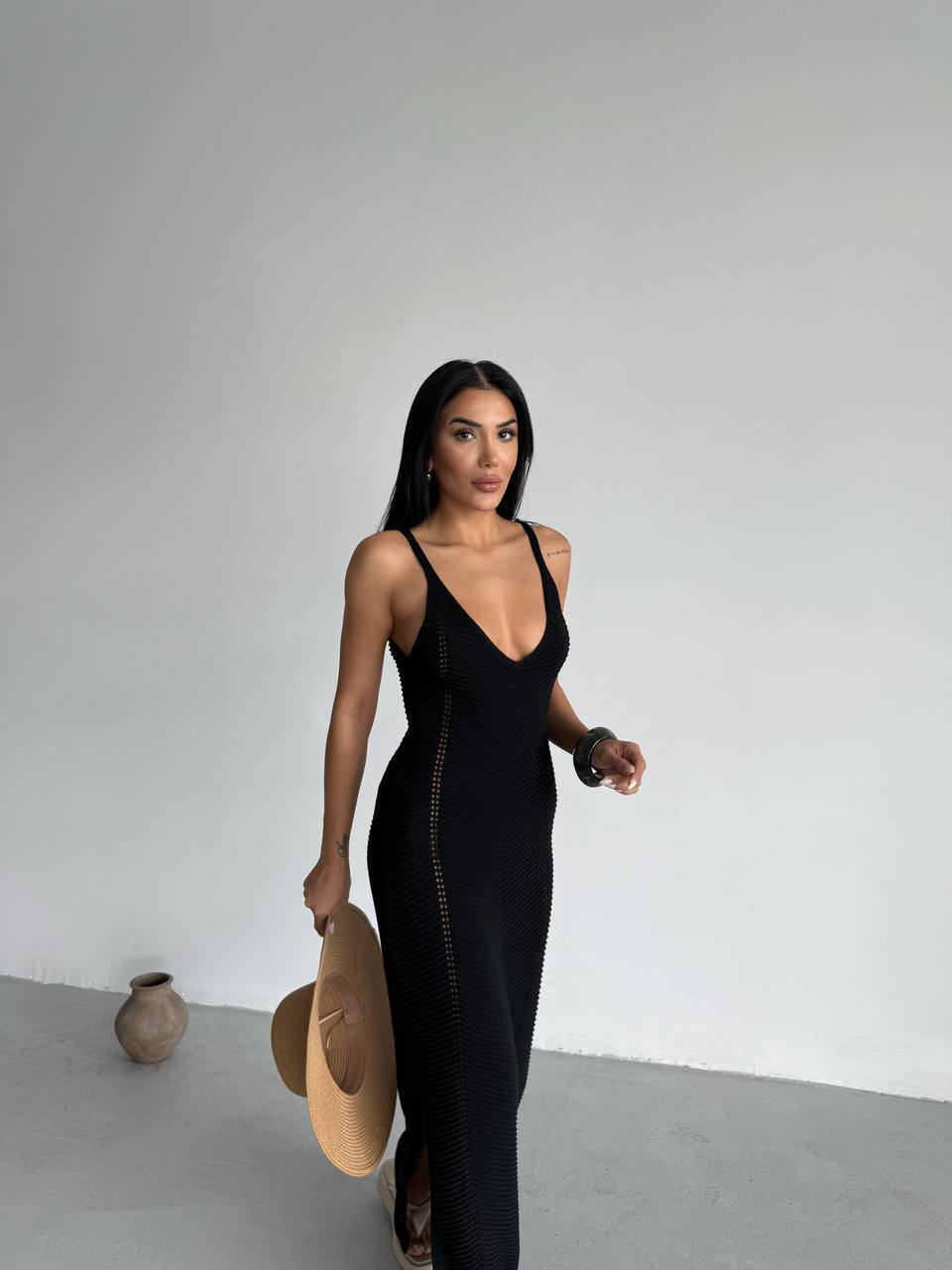 Жіноча Довга Літня Силуетна Чорна Сукня з Глибоким Вирізом та Розрізом Збоку