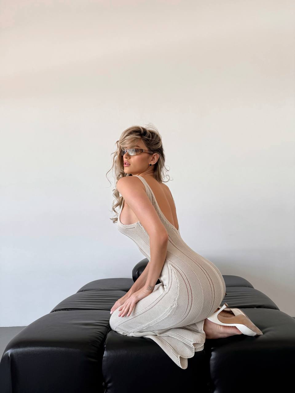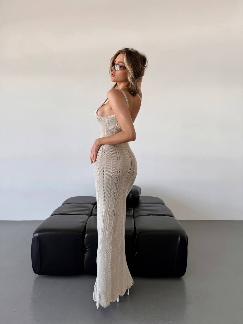 Жіноча Довга Облягаюча В’язана Бежева Сукня Максі з Відкритою Спиною