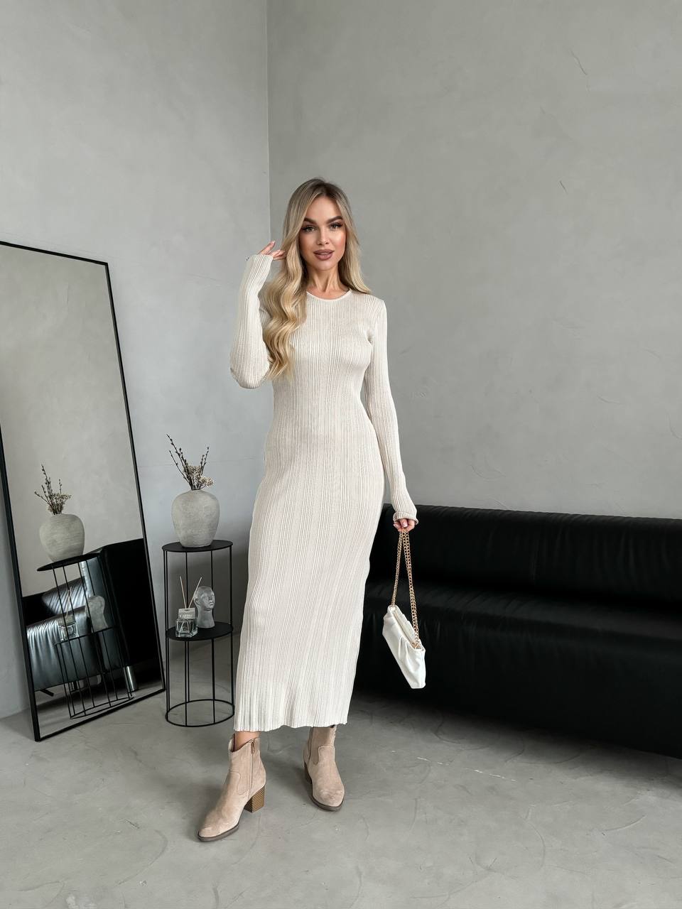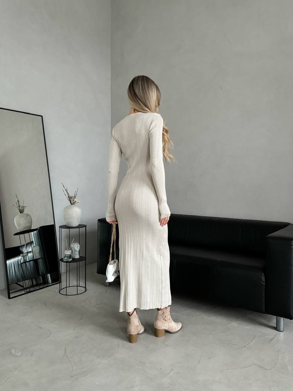 Жіноча Довга Приталена Бежева Сукня з Фактурними Смужками