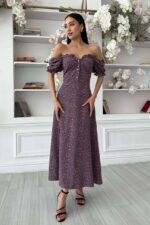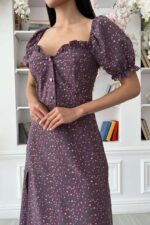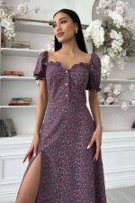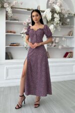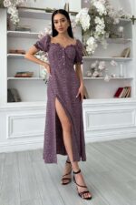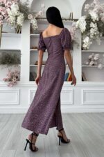 Жіноча Довга Сливова Сукня Амбі Максі – в Принт Дрібних Квіточках з Розрізом Рюшами та Короткими Рукавами