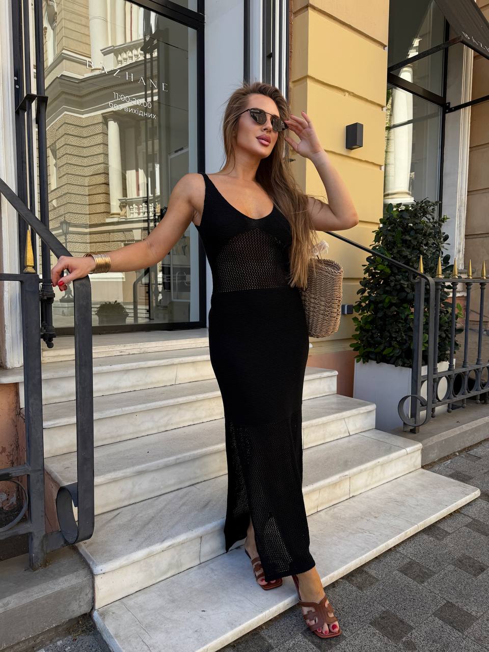 Жіноча Довга Силуетна Чорна Літня Сукня з Сіточкою на Животі та Розрізом Збоку