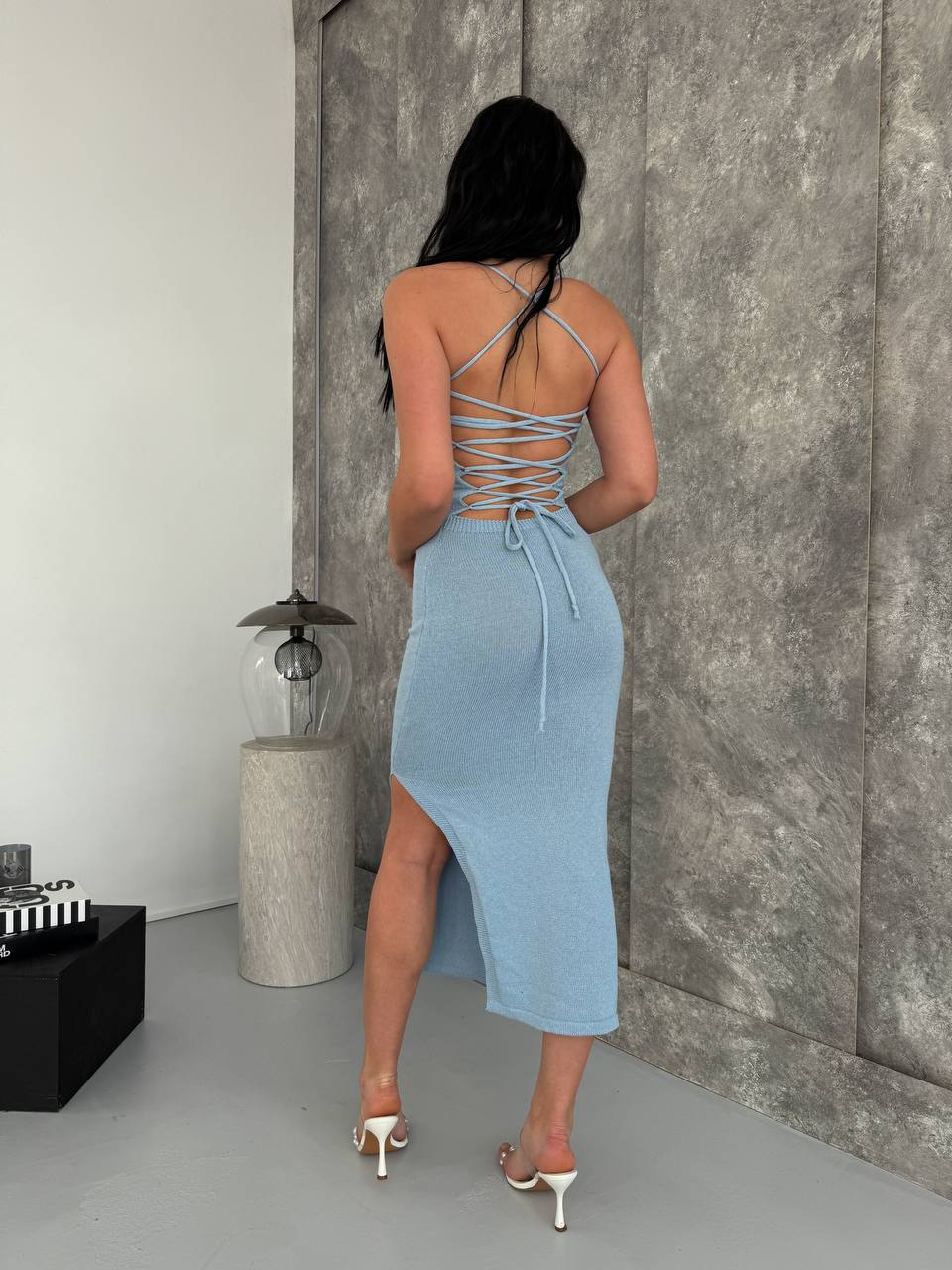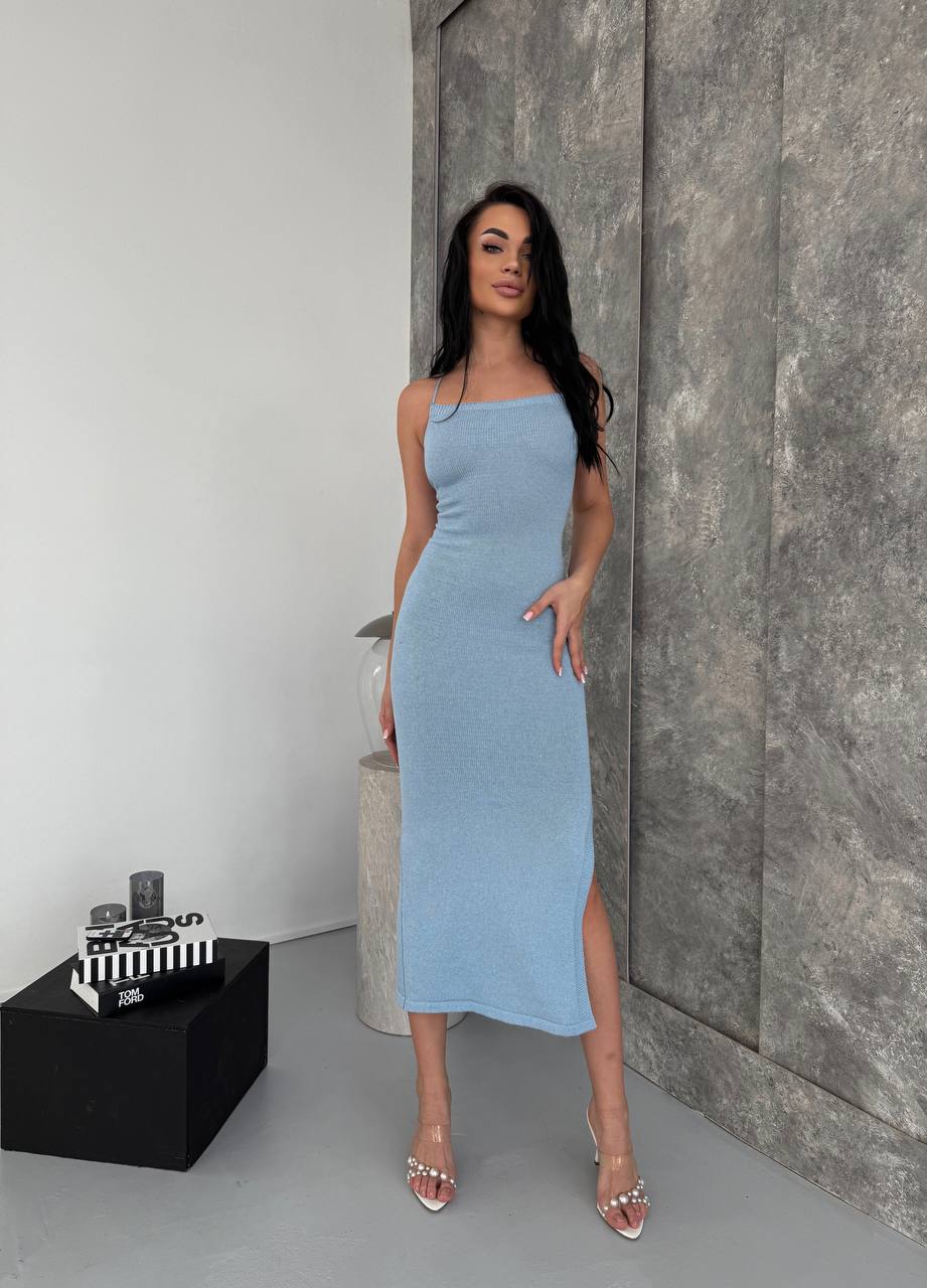 Жіноча Довга Трикотажна Блакитна Сукня на Бретелях зі Шнурівкою на Спині та Розрізом на Нозі