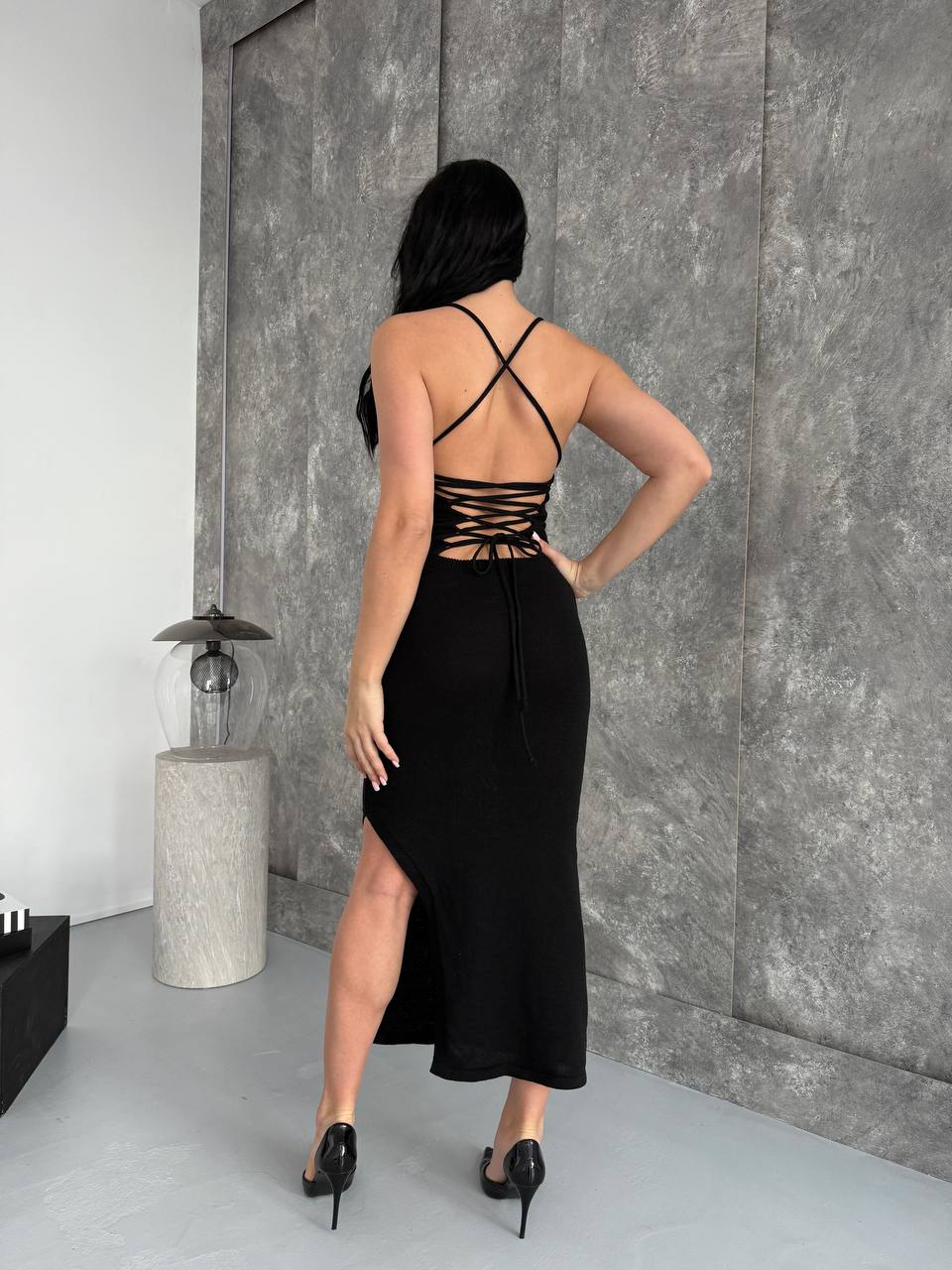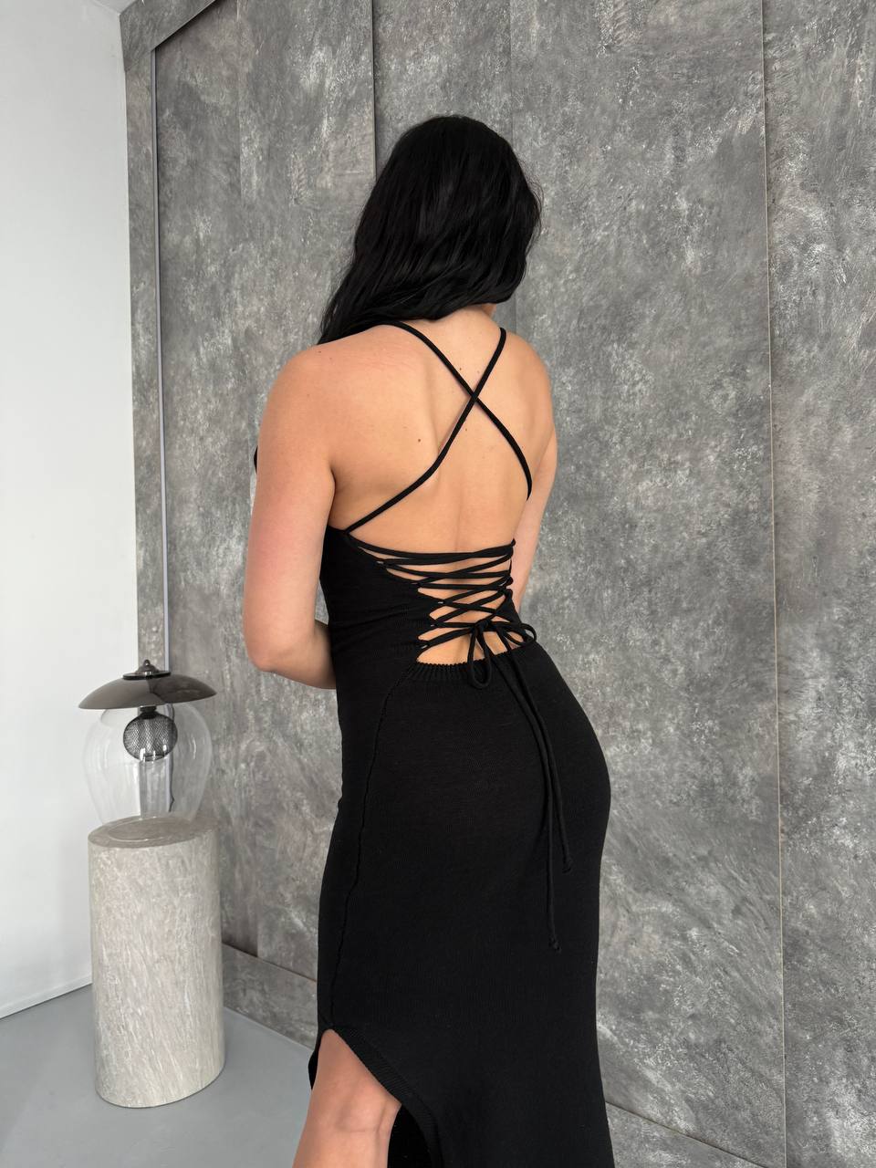 Жіноча Довга Трикотажна Чорна Сукня на Бретелях зі Шнурівкою на Спині та Розрізом на Нозі
