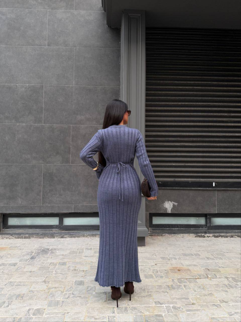 Жіноча Довга Трикотажна Графітова Сукня в Широкий Рубчик з Довгими Рукавами і Зав’язкою на Талії