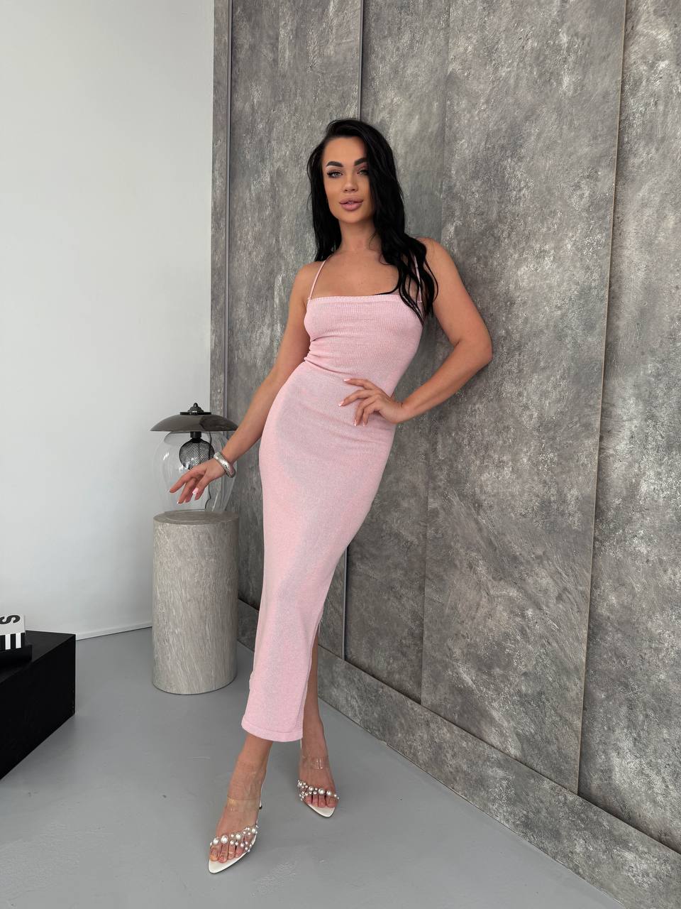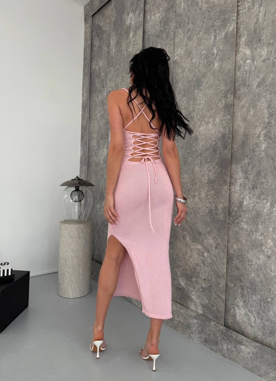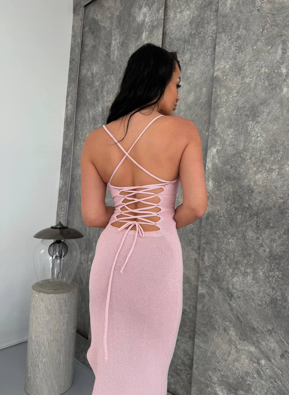 Жіноча Довга Трикотажна Рожева Сукня на Бретелях зі Шнурівкою на Спині та Розрізом на Нозі
