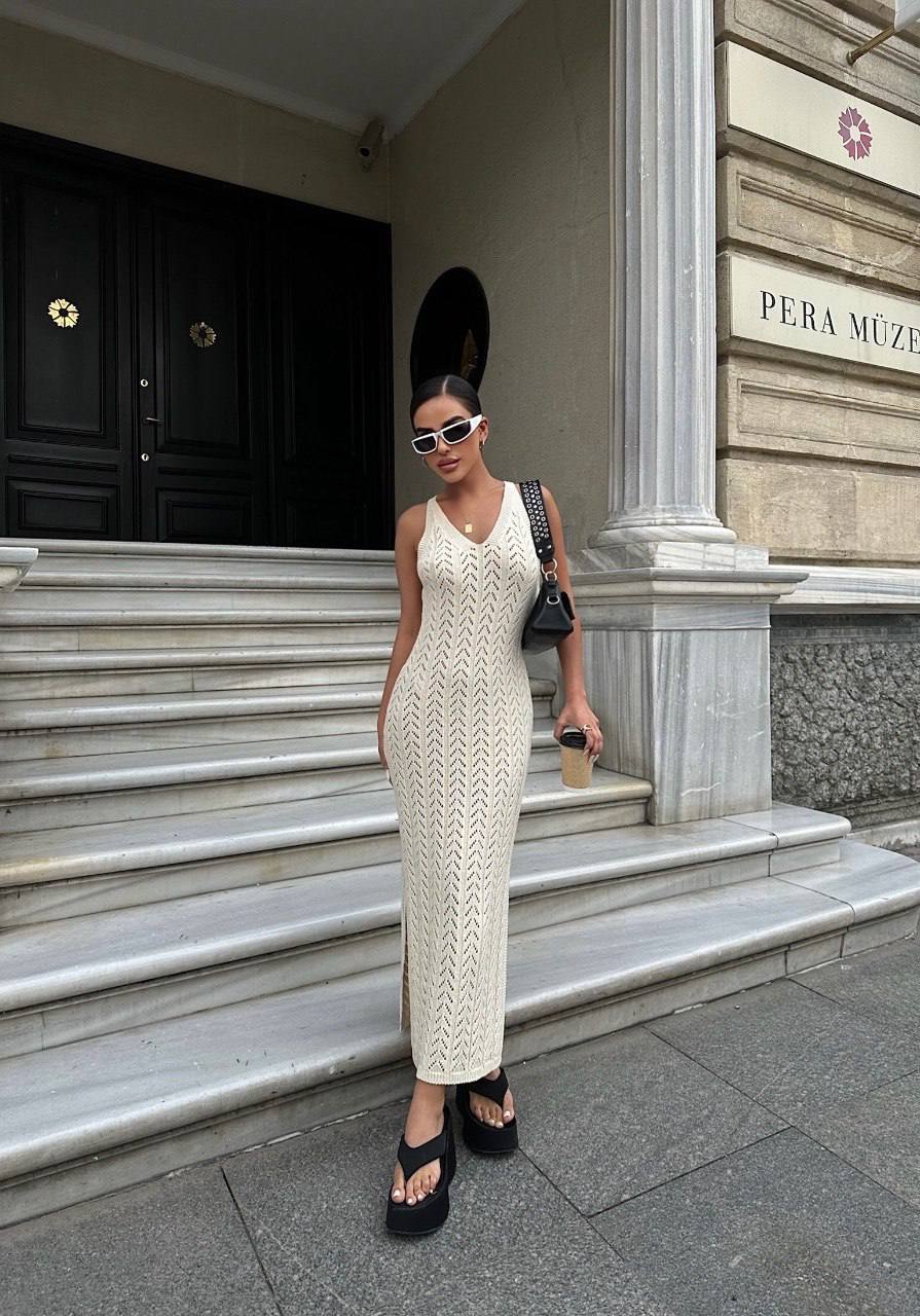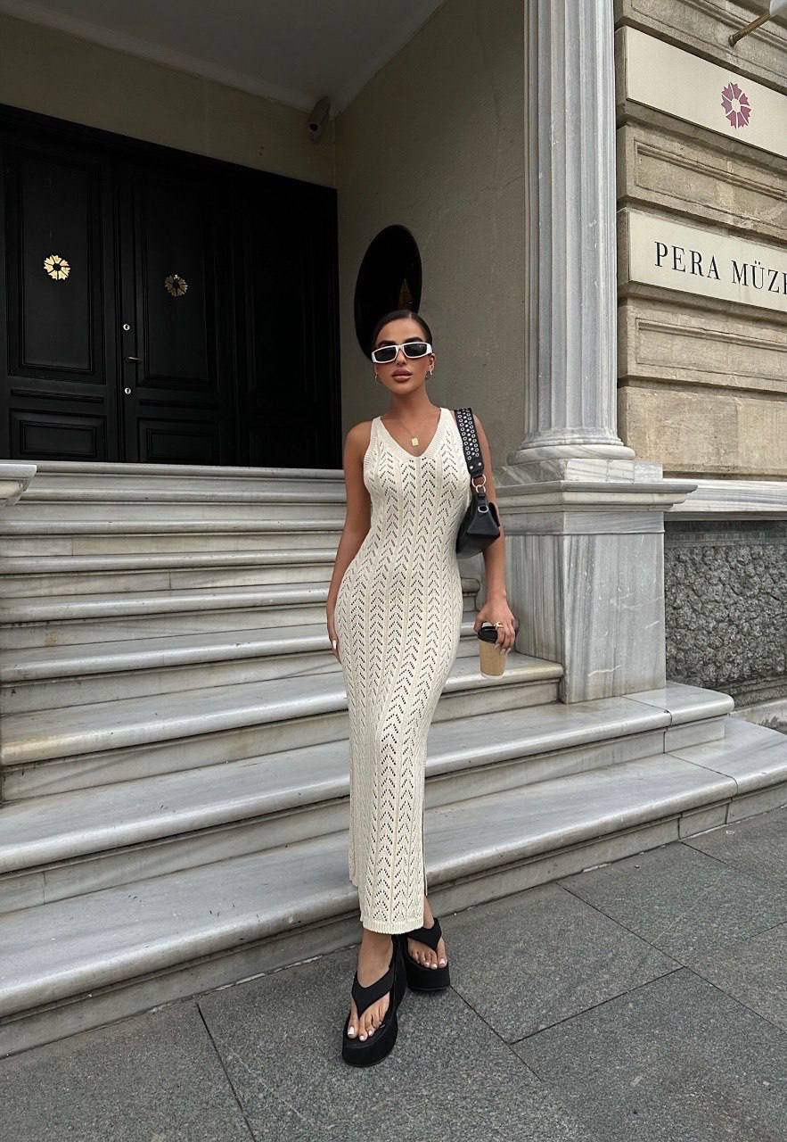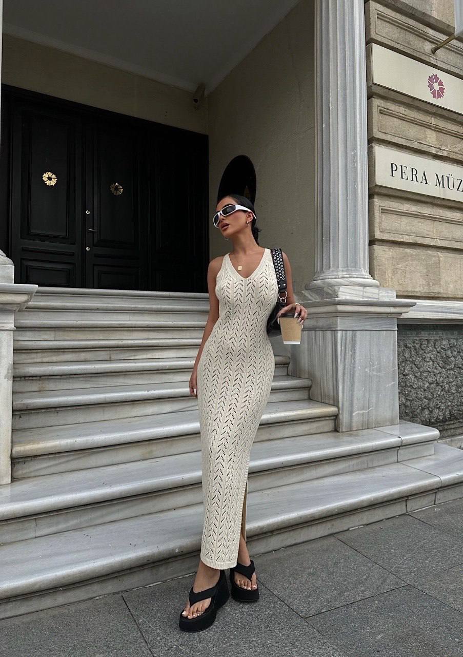 Жіноча Довга В’язана Бежева Сукня з Ажурним Візерунком та Глибоким V-вирізом