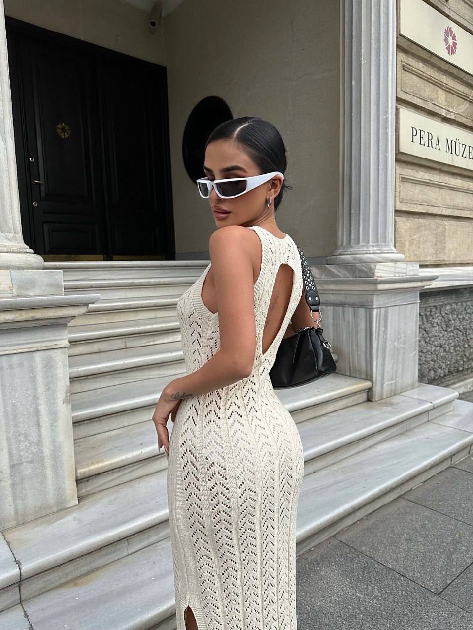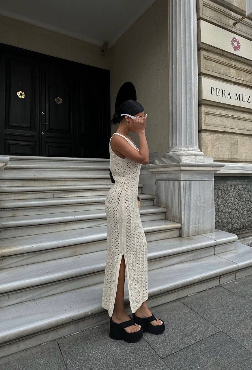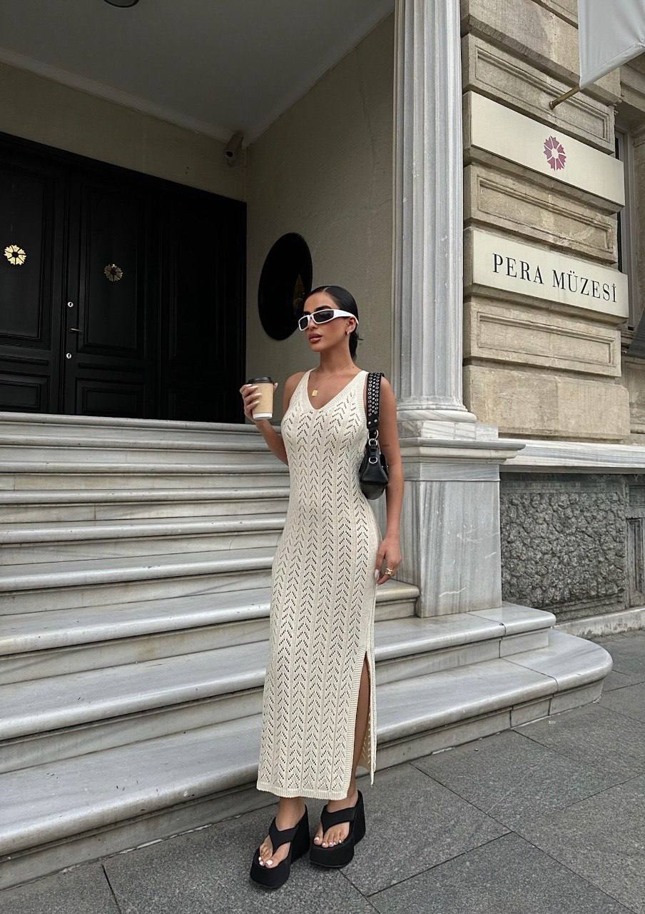 Жіноча Довга В’язана Бежева Сукня з Ажурним Візерунком та Глибоким V-вирізом