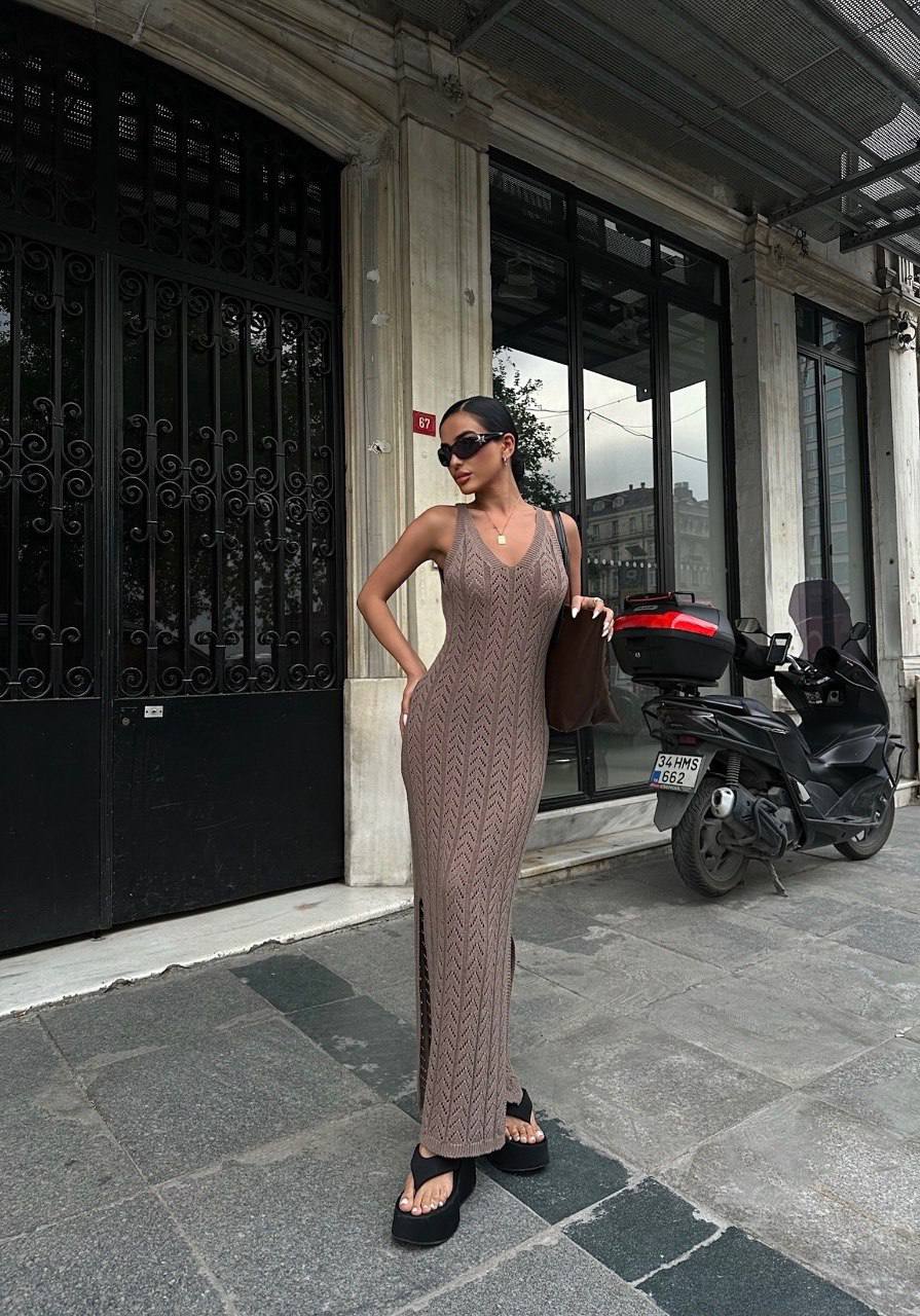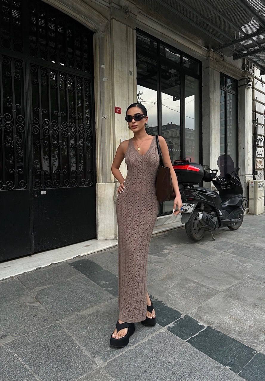 Жіноча Довга В’язана Коричнева Сукня з Ажурним Візерунком та Глибоким V-вирізом