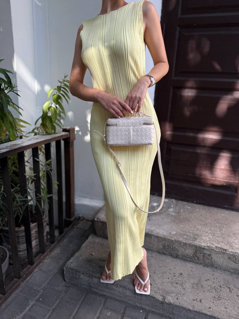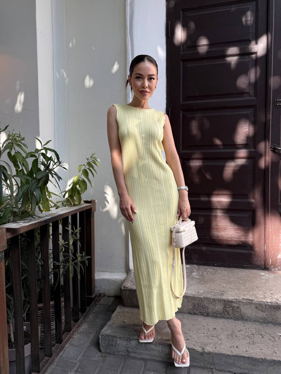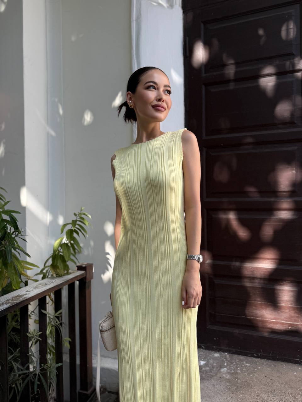 Жіноча Довга Жовта Сукня Максі без Рукавів у Фактурну Смужку